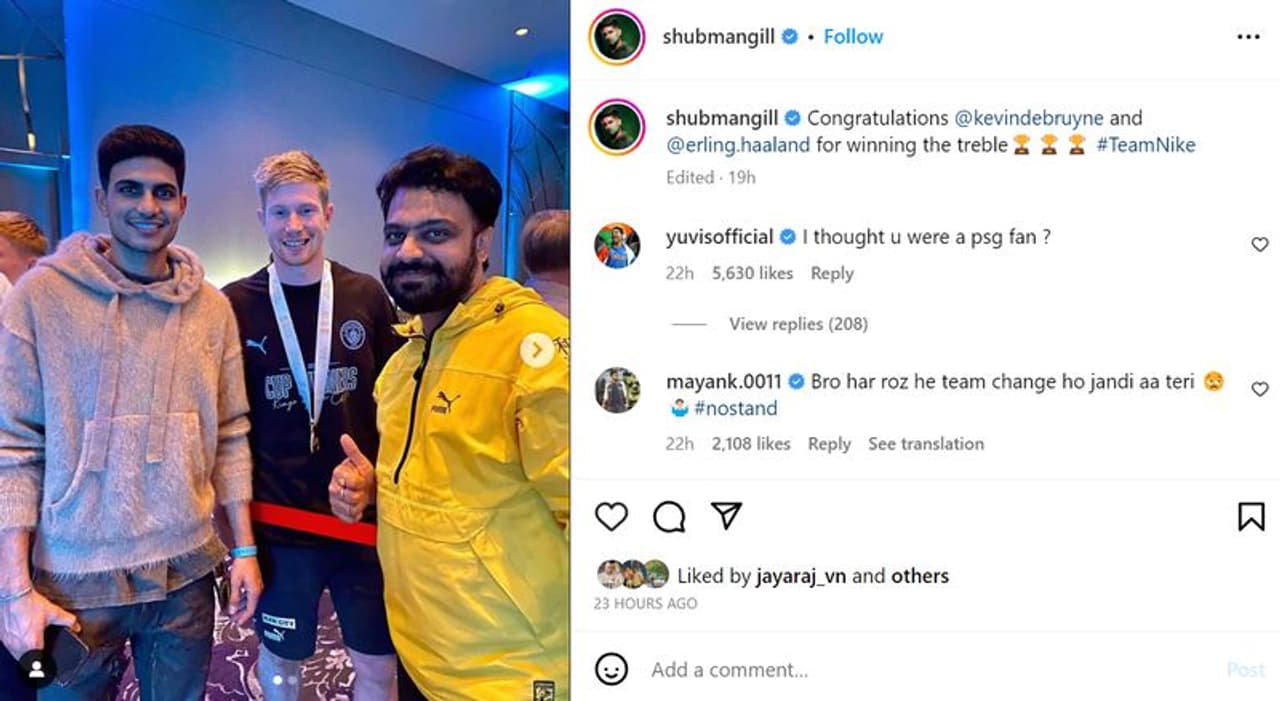 ഇപ്പോള് ഗില്ലുമായി ബന്ധപ്പെട്ട മറ്റൊരു ചിത്രമാണ് വൈറലാകുന്നത്. യുവേഫ ചാംപ്യന്സ് ലീഗ് നേടിയ മാഞ്ചസ്റ്റര് സിറ്റിയുടെ സ്ട്രൈക്കര് എര്ലിംഗ് ഹാളണ്ടുമൊത്തുള്ള ചിത്രമാണത്. ഹാളണ്ട് മാത്രമല്ല, മധ്യനിര താരം കെവിന് ഡി ബ്രൂയ്നും ഗില്ലിനൊപ്പം ഫോട്ടോയ്ക്ക് പോസ് ചെയ്യുന്നുണ്ട്.