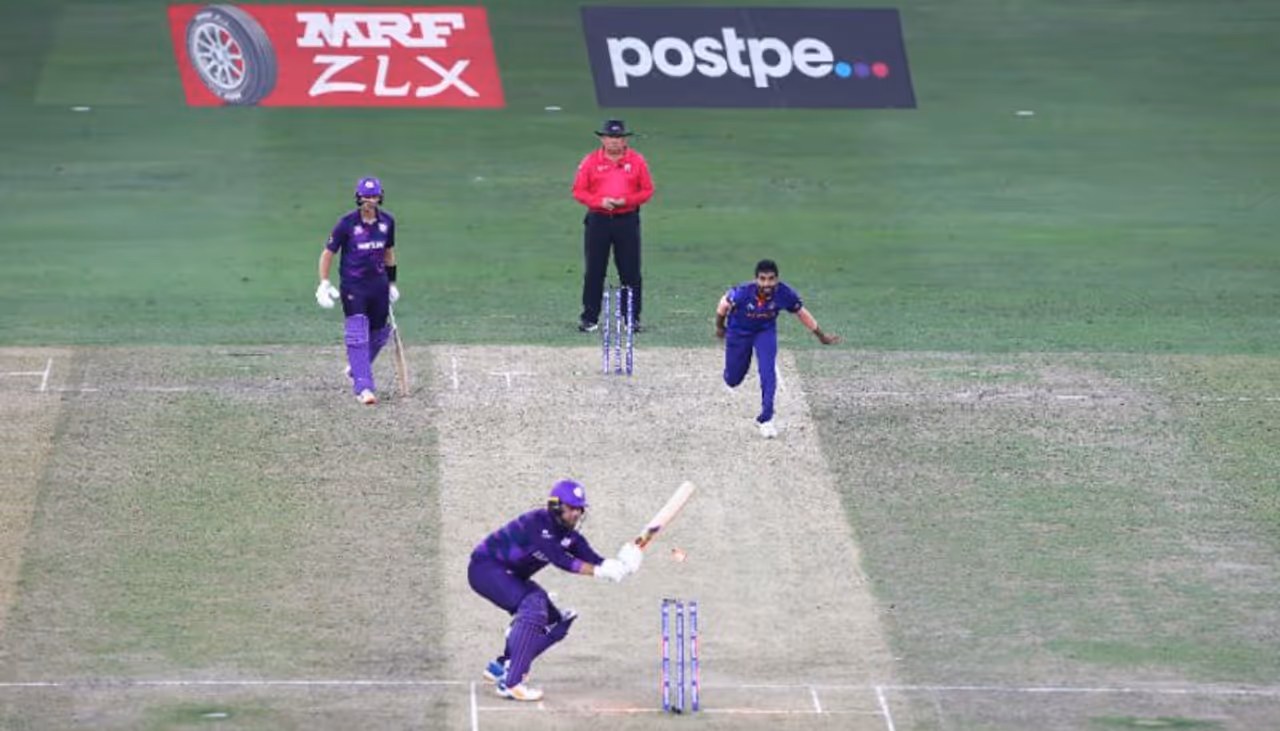 സ്കോട്ലന്ഡ് ബാറ്റ്സ്മാന്മാരെ ഇന്ത്യന് ബൗളര്മാര് വെള്ളംകുടിപ്പിച്ച മത്സരത്തില് രണ്ട് വിക്കറ്റുകളാണ് ജസ്പ്രീത് ബുമ്ര സ്വന്തമാക്കിയത്. ഇന്നിംഗ്സിലെ മൂന്നാം ഓവറിലെ മൂന്നാം പന്തില് നായകന് കെയ്ല് കോട്സറിനെ ബൗള്ഡാക്കി ബുമ്ര തുടങ്ങി. ഏഴ് പന്തില് ഒരു റണ്ണേ കോട്സര് നേടിയുള്ളൂ. ഒടുവില് സ്കോട്ടിഷ് നിരയിലെ അവസാനക്കാരന് മാര്ക്ക് വാട്ടിനെയും ബുമ്ര ബൗള്ഡാക്കി. 18-ാം ഓവറിലെ നാലാം പന്തിലായിരുന്നു ഈ വിക്കറ്റ്. 13 പന്തില് 14 റണ്സാണ് വാട്ടിന്റെ സമ്പാദ്യം.