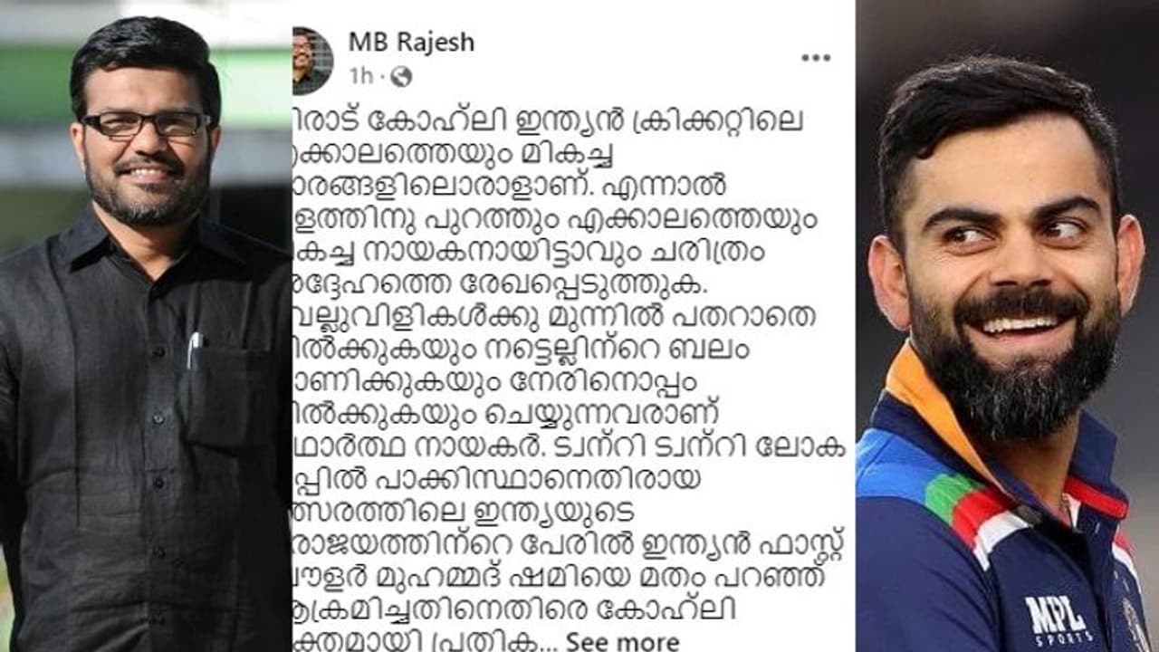 ഷമിയുടെ മതം പറഞ്ഞ് വാളെടുത്തവര്ക്കെതിരെ കടുത്ത ഭാഷയിലാണ് ഇന്ത്യന് ക്യാപ്റ്റന് വിരാട് കോലി (Virat Kohli) പ്രതികരിച്ചത്. മതം പറഞ്ഞത് ഒരാളെ ആക്രമിക്കുന്നതും നട്ടെല്ലില്ലായ്മയും പരിതാപകാരവുമാണെന്ന് കോലി പറഞ്ഞിരുന്നു. ഇന്ത്യന് താരങ്ങളില് നിന്നോ ബിസിസിഐയുടെ ഭാഗത്ത് നിന്നോ ഉണ്ടാവുന്ന ആദ്യ പ്രതികരമായിരുന്നത്. കോലിയുടെ പ്രസ്താവനയെ അഭിനന്ദിച്ച് രംഗത്തെത്തിയിരിക്കുകയാണ് നിയമസഭാ സ്പീക്കര് എം ബി രാജേഷ്(MB Rajesh).