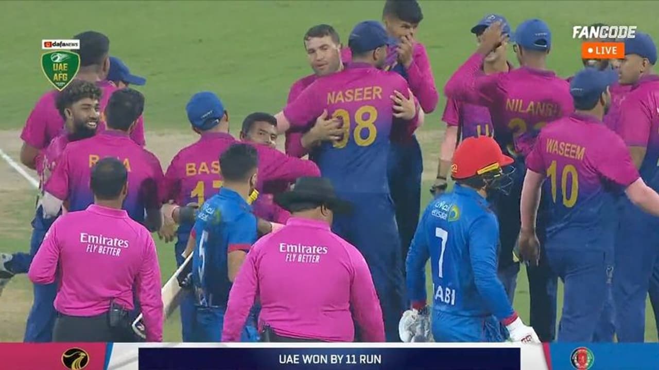ക്വായിസ് അഹമ്മദും(18) നബിയും ചേര്ന്ന് വിജയപ്രതീക്ഷ ഉയര്ത്തിയെങ്കിലും ക്വായിസിനെ അലി നസീർ മടക്കിയതോടെ അഫ്ഗാന് തോല്വി ഉറപ്പിച്ചു. 128-9ലേക്ക് വീണശേഷം മുഹമ്മദ് നബി തകര്പ്പനടികളോടെ ഒറ്റക്ക് പൊരുതി. എന്നാല് അവസാന രണ്ട് പന്തില് ജയിക്കാന് 12 റണ്സ് വേണമെന്ന ഘട്ടത്തില് നബി വീണതോടെ യുഎഇയുടെ ചരിത്രവിജയം പൂര്ത്തിയായി. യുഎഇക്കായി അലി നസീറും മുഹമ്മദ് ജവാദുള്ളയും നാല് വിക്കറ്റ് വീതം വീഴ്ത്തി.