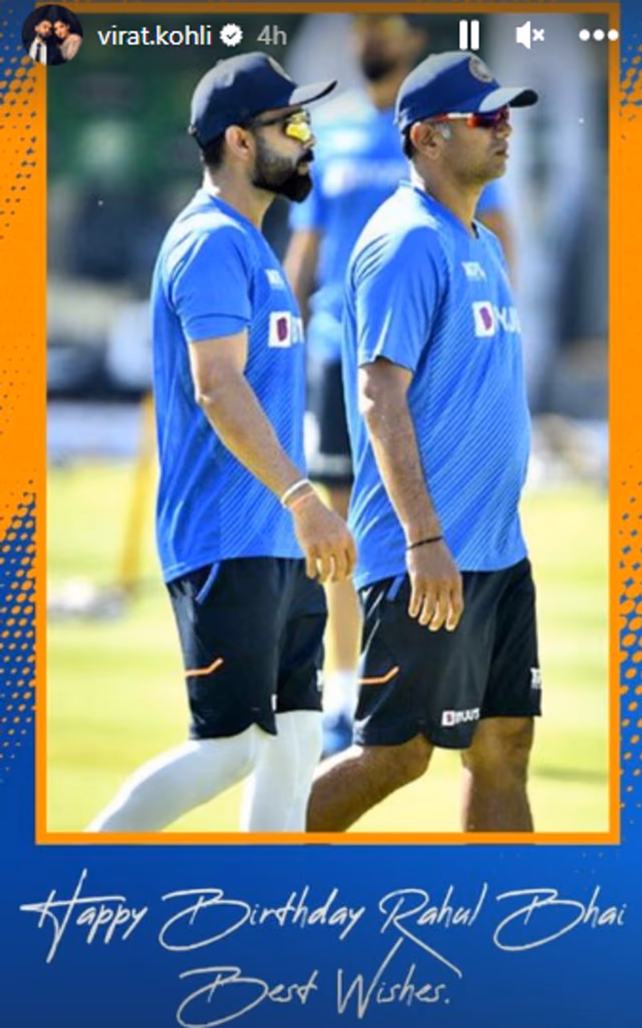 ഇതില് പ്രധാനി മുന് ഇന്ത്യന് ക്യാപ്റ്റന് വിരാട് കോലി തന്നെ. തന്റെ ഇന്സ്റ്റഗ്രാം അക്കൗണ്ടില് സ്റ്റോറിയായിട്ടാണ് കോലി ആശംസ അറിയിച്ചത്. 2021 നവംബര് മൂന്നിനാണ് ദ്രാവിഡ് ഇന്ത്യയുടെ കോച്ചായി ചുമതലയേല്ക്കുന്നത്. പിന്നീട് തന്റെ സെഞ്ചുറി വരള്ച്ചയ്ക്ക് വിരാമമിട്ടതും ദ്രാവിഡിന് കീഴില് തന്നെ.