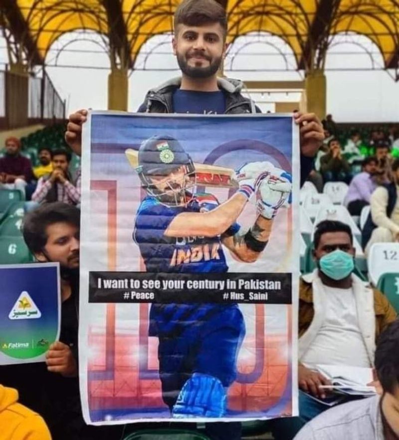 പാക്കിസ്ഥാന് സൂപ്പര് ലീഗ് (PSL)മത്സരത്തിനിടെ ഗദ്ദാഫി സ്റ്റേഡിയത്തില് കോലിയുടെ ചിത്രവുമായി(Virat Kohli Photo) നില്ക്കുന്ന ലാഹോര് സ്വദേശിയുടെ ചിത്രമാണ് ഇപ്പോള് സമൂഹമാധ്യമങ്ങളില് വൈറലാവുന്നത്. കോലി ബാറ്റ് ചെയ്യുന്ന പോസ്റ്ററിന് താഴെ താങ്കള് പാക്കിസ്ഥാനില് സെഞ്ചുറി നേടുന്നത് കാണാനാണ് ഞാന് ആഗ്രഹിക്കുന്നത് എന്നെഴുതിയ ചിത്രമാണ് ആരാധകര് ഏറ്റെടുത്തത്.