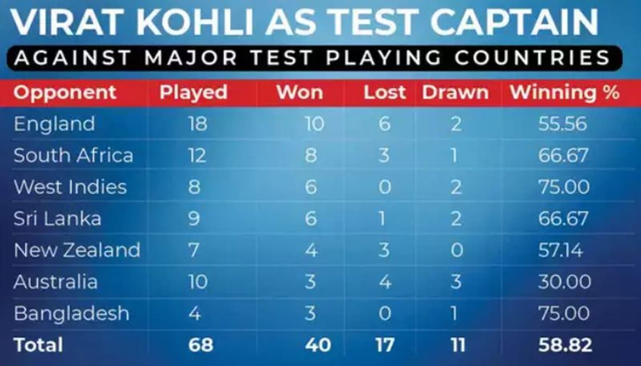 ഇന്ത്യയുടെ എക്കാലത്തേയും മികച്ച ടെസ്റ്റ് ക്യാപ്റ്റനെന്ന ഖ്യാതിയോടെയാണ് കോലി ക്യാപ്റ്റന് സ്ഥാനത്ത് നിന്ന് പടിയിറങ്ങുന്നത്. 58.82-ാണ് ടെസ്റ്റില് കോലിയുടെ വിജയ ശതമാനം. മൊത്തത്തില് 68 ടെസ്റ്റുകളില് കോലി ഇന്ത്യയെ നയിച്ചു. 40 മത്സങ്ങള് ജയിച്ചു. ധോണി നയിച്ച 60 ടെസ്റ്റുകളില് 27 മാത്രമാണ് ജയിച്ചത്. ഗാംഗുലി 49 ടെസ്റ്റുകളില് ജയിച്ചപ്പോള് 21 മത്സരം ജയിച്ചു. ഇന്ത്യയെ ഏറ്റവും കൂടുതല് ടെസ്റ്റ് വിജയങ്ങളിലേക്ക് നയിച്ചതും കോലിയാണ്.
