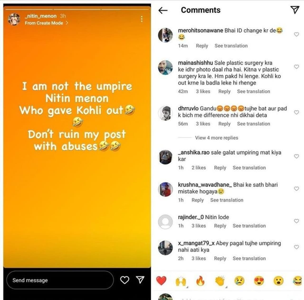 കടുത്ത വിമര്ശനമാണ് ഇന്ത്യന് ക്രിക്കറ്റ് ടീം ആരാധകര് ഇതിനെതിരെ ഉയര്ത്തുന്നത്. അമ്പയര് നിതിൻ മേനോനെതിരെ രൂക്ഷ വിമര്ശനങ്ങള് സാമൂഹ്യ മാധ്യമങ്ങളില് ഒരുപാട് പേര് ഉയര്ത്തുന്നുണ്ട്. ഇതിനിടെയില് 'പെട്ട് പോയത്' മറ്റൊരു നിതിൻ മേനോനാണ്. തന്റെ പോസ്റ്റുകള് താഴെ സൈബര് ആക്രമണം രൂക്ഷമായതോടെ അദ്ദേഹത്തിന് പ്രതികരിക്കേണ്ടിയും വന്നു. കോലിയെ ഔട്ട് വിധിച്ച അമ്പയര് നിതിൻ മേനോന് താനല്ലെന്നും തന്റെ പോസ്റ്റ് താഴെയുള്ള അധിക്ഷേപ കമന്റുകള് നിറച്ചിട്ട് കാര്യമില്ലെന്നുമാണ് യുവാവ് പ്രതികരിച്ചത്.