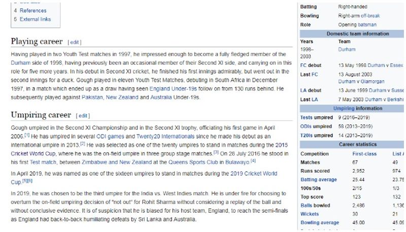 '2019ല് ഇന്ത്യ- വെസ്റ്റ് ഇന്ഡീസ് മത്സരത്തില് ഗഫായായിരുന്നു മൂന്നാം അംപയര്. രോഹിത് ശര്മ്മ നോട്ട് ഔട്ടാണെന്ന മൂന്നാം അംപയറുടെ തീരുമാനം വേണ്ടത്ര റീ പ്ലേകളും വ്യക്തമായ തെളിവുകളുമില്ലാതെ മാറ്റിയ ഗഫ് വിമര്ശനങ്ങള് നേരിടുകയാണ്. ആതിഥേയരായ ഇംഗ്ലണ്ടിന് അനുകൂലമാണ് അംപയര് എന്നാണ് സംശയിക്കപ്പെടുന്നത്. ശ്രീലങ്കയോടും ഓസട്രേലിയയോടും തോറ്റ ഇംഗ്ലണ്ടിനെ സെമിയില് പ്രവേശിപ്പിക്കാനാണ് ഈ നീക്കമെന്നും' ഗഫിന്റെ വിക്കിപീഡിയ പേജില് ആരാധകര് എഡിറ്റ് ചെയ്തു ചേര്ത്തു.