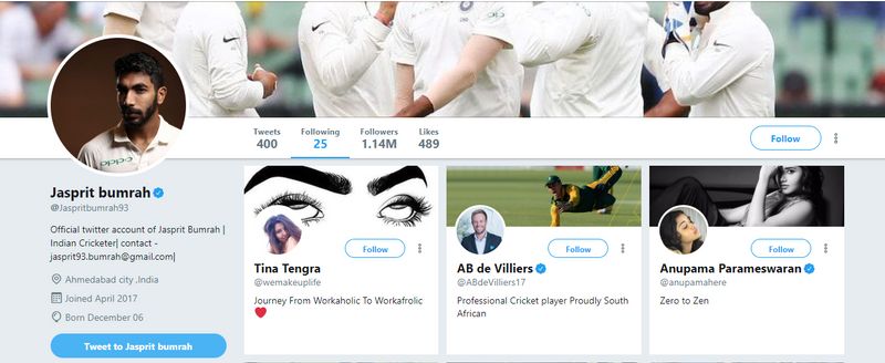 സച്ചിന് ടെന്ഡുല്ക്കര്, റോജര് ഫെഡറര്,എം.എസ്.ധോണി, യുവ്രാജ് സിംഗ്, അനില് കുംബ്ലെ,ഫീല്ഡിംഗ് കോച്ച് ആര്. ശ്രീധര് എന്നിങ്ങനെ ക്രിക്കറ്റുമായി ബന്ധപ്പെട്ടവരെയാണ് ബൂമ്ര ഫോളോ ചെയ്യുന്ന മറ്റുള്ളവര്.തൃശ്ശൂര് ഇരിങ്ങാലക്കുട സ്വദേശിയായ അനുപമ ടോളിവുഡിലെ തിരക്കേറിയ നായകിയാണിപ്പോള്.