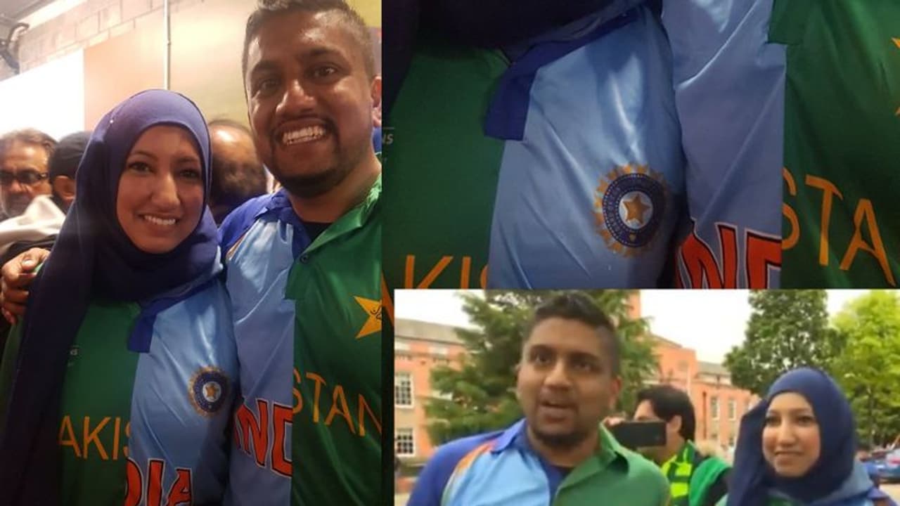 ഭര്ത്താവ് പാക്കിസ്ഥാനിയും ഭാര്യം ഇന്ത്യക്കാരിയും ആണെന്നതിനാല് ഇരുരാജ്യങ്ങളുടെയും ജേഴ്സികള് പകുതി വീതമുള്ള വസ്ത്രം ധരിച്ചാണ് ഇരുവരും ഗ്യാലറിയിലെത്തിയത്.