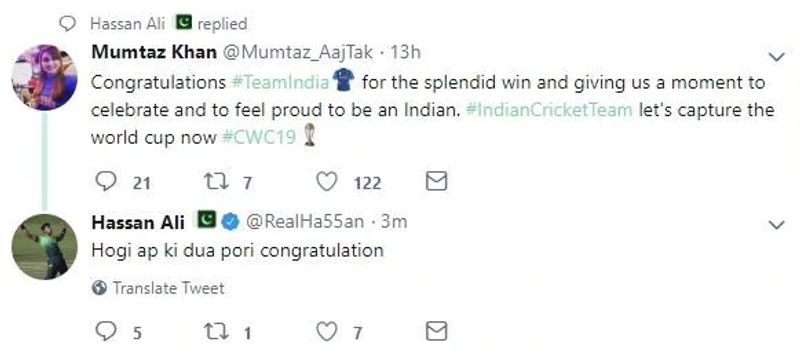 എന്നാല്, ഇതിന് മറുപടി നല്കിയ ഹസന് അലിക്ക് അല്പം ഒന്ന് പിഴച്ചു. നിങ്ങളുടെ പ്രാര്ഥനകള് സഫലമാകുമെന്നായിരുന്നു ഹസന് അലിയുടെ വാക്കുകള്. ഇതോടെ ഇന്ത്യ ലോകകപ്പ് നേടുമെന്ന ആഗ്രഹം സഫലമാകുമെന്ന പറഞ്ഞ ഹസന് അലിയെ വിമര്ശിച്ച് പാക് ആരാധകര് രംഗത്ത് വന്നു. ഇതോടെ താരം ആ പ്രതികരണം നീക്കുകയായിരുന്നു. 'ഇന്ത്യ ടുഡേ'യാണ് വാര്ത്ത റിപ്പോര്ട്ട് ചെയ്തത്.