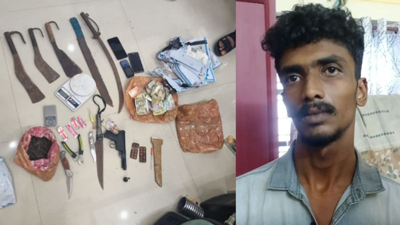 കഞ്ചാവും, തോക്ക്, വടിവാൾ, ഉൾപ്പെടെ പത്തോളം മാരകായുധങ്ങളും കഞ്ചാവ് തൂക്കി വിൽപ്പന നടത്താൻ ഉപയോഗിക്കുന്ന വൈദ്യുതി ത്രാസ്, ലഹരി വസ്തുക്കള് ഉപയോഗിക്കാനായുള്ള സിറിഞ്ച്, വിവിധ ലഹരി ടാബ്ലറ്റുകൾ, ഓൺലൈൻ പാർസൽ കവറുകൾ ഉൾപ്പെടെ പൊലീസ് കണ്ടെത്തി.