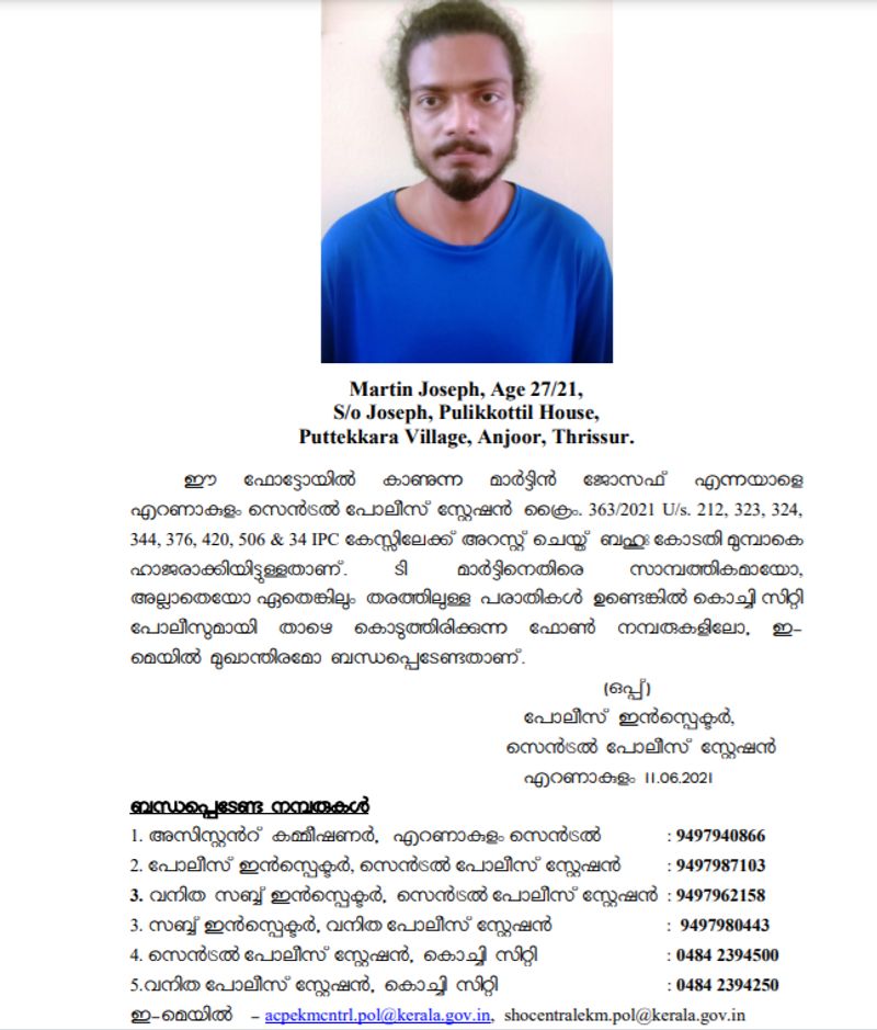 മാർട്ടിനെതിരെ പരാതിയുള്ളവർക്ക്, അത് സാമ്പത്തിക തർക്കങ്ങളോ മറ്റെന്ത് പരാതികളോ ആകട്ടെ പൊലീസിനെ സമീപിക്കാം. വിളിക്കേണ്ട നമ്പർ പുറത്ത് വിട്ട് പൊലീസ്.