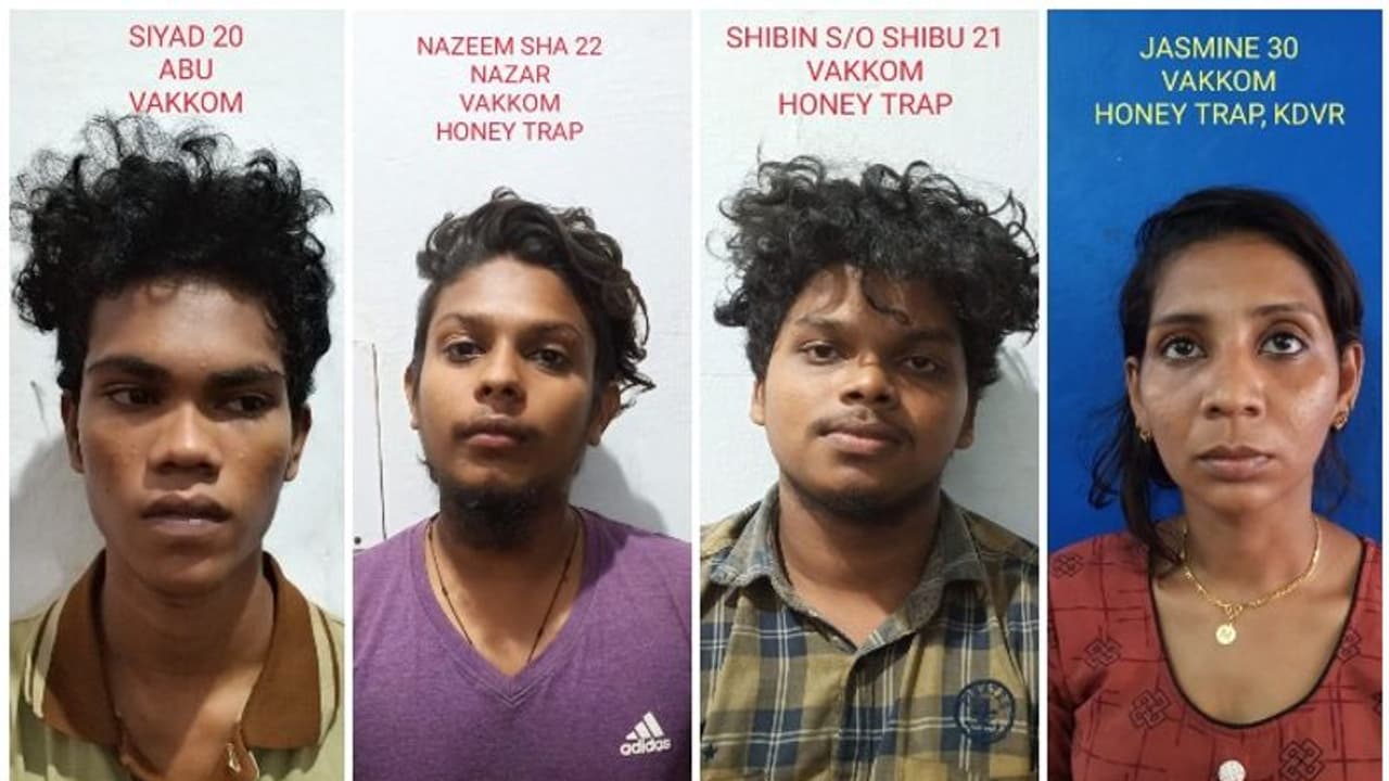 സംഘത്തില് കൂടുതല് ആളുകളുണ്ടെന്നും പൊലീസ് അറിയിച്ചു. വക്കം പാടപുരയിടം വീട്ടിൽ ജാസ്മിൻ(30), വക്കം മേത്തരുവിളാകം വീട്ടിൽ സിയാദ്(20), വക്കം ചക്കൻവിള വീട്ടിൽ നസീം(22), വക്കം എസ്.എസ് മൻസിലിൽ ഷിബിൻ(21) എന്നിവരാണ് പിടിയിലായത്. ആലംകോട് സ്വദേശിയായ മധ്യവയസ്കൻ നൽകിയ പരാതിയിലാണ് അറസ്റ്റ്.