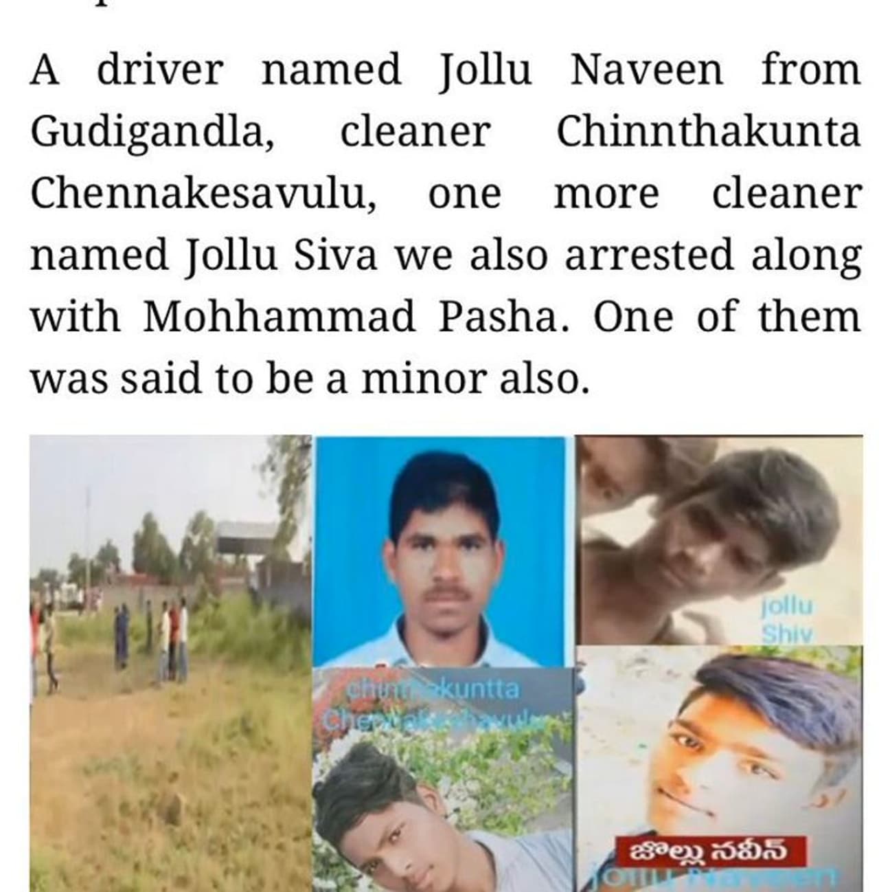 ബുധനാഴ്ച രാത്രി നടന്ന കൊലപാതകത്തിന്റെ ഞെട്ടിപ്പിക്കുന്ന വിവരങ്ങളാണ് പുറത്ത് വന്നത്. സംഭവത്തില് ലോറി ഡ്രൈവര് മുഹമ്മദ് ആരിഫ്, ജൊല്ലു ശിവ, ജൊല്ലു നവീന്, ചന്നകേശലവു എന്നിങ്ങനെ നാല് പേര് പൊലീസിന്റെ പിടിയിലായിട്ടുണ്ട്. മൃതദേഹം കിട്ടുന്നതിന്റെ തലേന്ന്, ബുധനാഴ്ച രാത്രി 9.22 ന് പെൺകുട്ടി സഹോദരിയെ ഫോണിൽ ബന്ധപ്പെട്ടിരുന്നു. ടോൾ പ്ലാസയിൽ നിർത്തിയിട്ടിരുന്ന തന്റെ സ്കൂട്ടിയുടെ ടയർ പഞ്ചറായ വിവരം യുവതി സഹോദരിയെ അറിയിച്ചു.