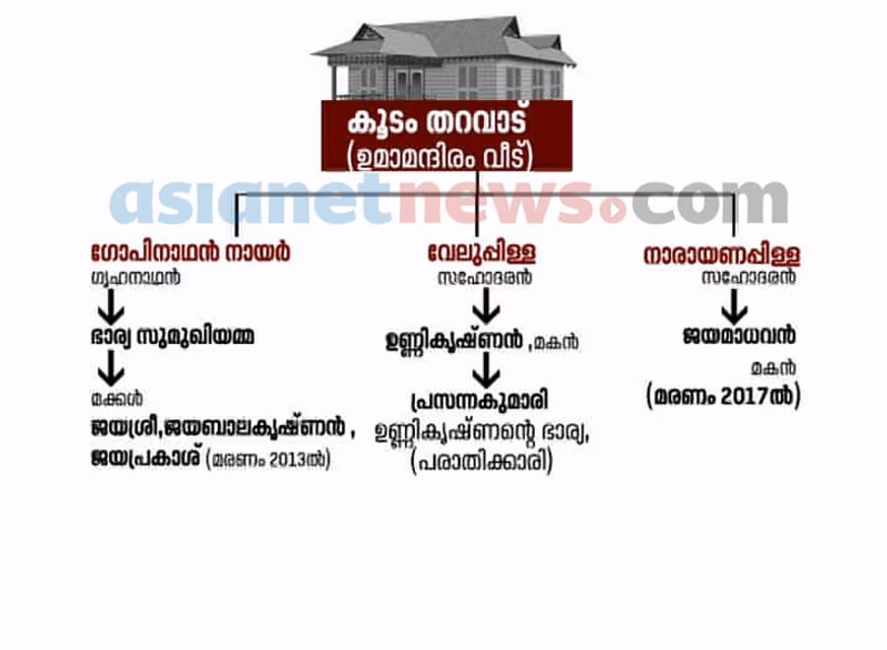അതേസമയം, ഉമാമന്ദിരം തറവാട്ടിൽ ഏറ്റവും അവസാനം മരിച്ച ജയമോഹന്റെ മരണത്തിൽ ദുരൂഹതയുണ്ടെന്നാണ് ക്രൈംബ്രാഞ്ചിന്റെ റിപ്പോർട്ട്. 30 കോടി രൂപയുടെ സ്വത്താണ് ഇരുവരുടെയും മരണശേഷം ഒരു ട്രസ്റ്റിന്റെ പേരിലേക്ക് വകമാറ്റിയത്. രവീന്ദ്രൻ നായർ എന്ന കാര്യസ്ഥൻ ജയമോഹനെ വീട്ടിൽ അബോധാവസ്ഥയിൽ കണ്ടെത്തിയിട്ടും അയൽക്കാരെപ്പോലും അറിയിക്കാതെ മെഡിക്കൽ കോളേജിലേക്ക് ഓട്ടോറിക്ഷയിൽ കൊണ്ടുപോവുകയായിരുന്നെന്നും ക്രൈംബ്രാഞ്ചിന്റെ റിപ്പോർട്ടിലുണ്ട്.