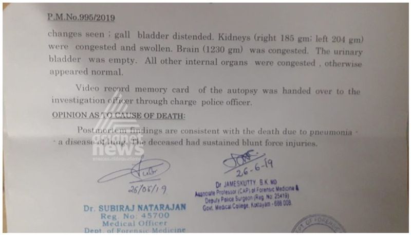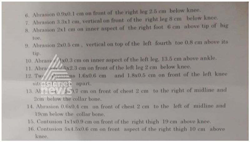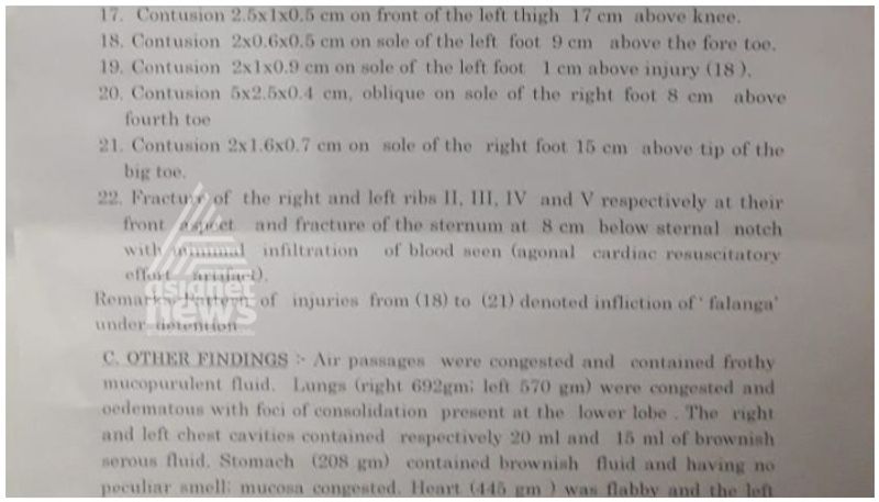 തുടയിലും കാൽവെള്ളയിലും ചതവുകളും അടിയേറ്റ പാടുകളും. ശരീരത്തിൽ ഏഴ് ചതവുകളും 22 പരിക്കുകളും. മരണകാരണം ആന്തരിക മുറിവുകളെ തുടർന്നുണ്ടായ ന്യൂമോണിയ. തെളിവുകളുമായി പോസ്റ്റ്മോർട്ടം റിപ്പോർട്ട് ഏഷ്യാനെറ്റ് ന്യൂസിന്.