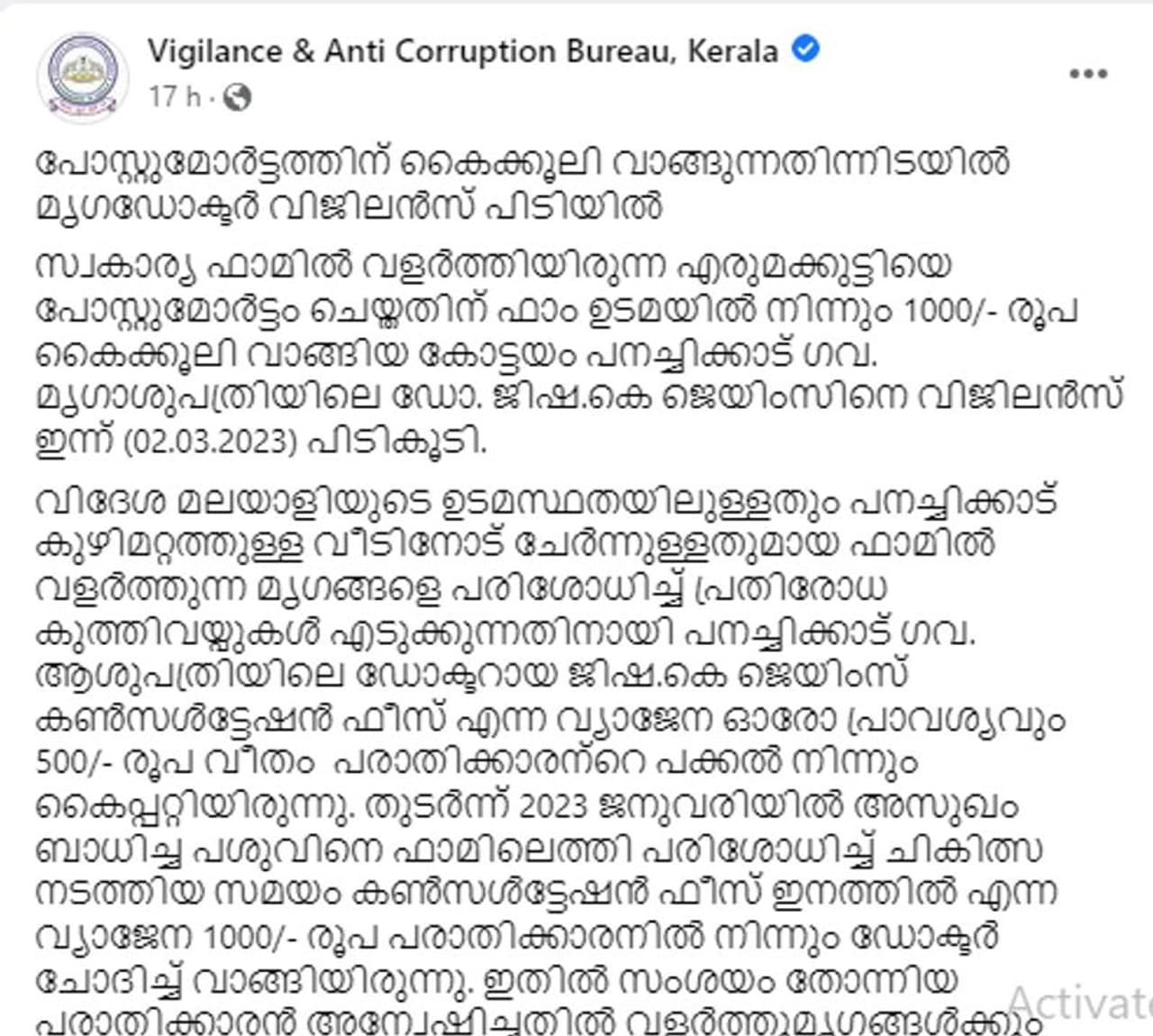 നേരത്തെ ഫാമില് വളര്ത്തുന്ന മൃഗങ്ങളെ പരിശോധിച്ച് പ്രതിരോധ കുത്തിവയ്പുകള് എടുക്കുന്നതിനായി ഡോക്ടര് ഫീസെന്ന പേരല് 500 രൂപ വീതം വാങ്ങിയിരുന്നുവെന്നാണ് പരാതിക്കാരന് പറയുന്നത്. പലതവണ ഇത്തരത്തില് പണം വാങ്ങിയിട്ടുണ്ടെന്നും പരാതിക്കാരന് പറയുന്നു. കഴിഞ്ഞ മാസം അവസാനമാണ് പരാതിക്കാരന്റെ ഫാമിൽ വളർത്തിയിരുന്ന എരുമക്കുട്ടി ചത്തുപോയത്. തുടർന്ന് മരണ കാരണം അറിയുന്നതിന് എരുമക്കുട്ടിയെ പോസ്റ്റുമോർട്ടം ചെയ്യുന്നതിന് ഡോക്ടറുടെ സേവനം കിട്ടുന്നതിനായി ഡോക്ടറുടെ ഫോണിലേയ്ക്ക് വിളിക്കുകയും അന്നേ ദിവസം തന്നെ ഡോക്ടർ ഫാമിലെത്തി എരുമക്കുട്ടിയെ പോസ്റ്റുമോർട്ടം ചെയ്യുകയും ഫീസായി 1000 രൂപ ആവശ്യപ്പെടുകയും ചെയ്തു.