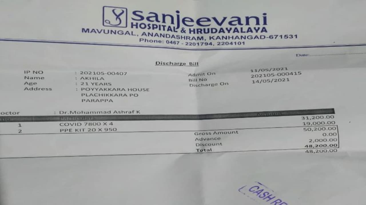 കൊവിഡ് ചികിൽസയ്ക്കായി കാഞ്ഞങ്ങാട്ടെ സഞ്ജീവനി ആശുപത്രി അമിത തുക ഈടാക്കിയതായി യുവതിയുടെ പരാതി. കൊവിഡ് ചികിൽസയിൽ കഴിഞ്ഞ നാലുദിവസത്തെ ബില്ലായി 50,200 രൂപ ആശുപത്രി വാങ്ങിയെന്നാണ് യുവതി ഡിഎംഒയ്ക്ക് പരാതി നൽകിയിരിക്കുന്നത്. ഓക്സിജനോ ഐസിയുവോ ഉപയോഗിക്കാതെയാണ് ഇത്രയും ബില്ലെന്നും യുവതി പരാതിയിൽ പറയുന്നു.