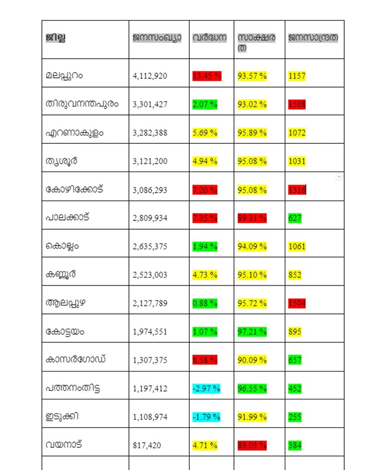 2001-2011 കാലയളവില് യു.പിയിലും, അസമിലുമൊക്കെ ജനസംഖ്യ വളര്ന്നത് 17 ശതമാനത്തിലേറെയാണ്. കേരളത്തില് 4.91% ജനസംഖ്യാ വര്ദ്ധനവാണ് ഉണ്ടായിട്ടുള്ളത്. എന്നാല് ജില്ലകള് തമ്മില് വലിയ അന്തരമുണ്ട്. മലപ്പുറത്ത് 13 ശതമാനത്തിലധികമാണ് വര്ദ്ധന. കാസര്ഗോഡും, പാലക്കാടും, കോഴിക്കോടും താരതമ്യേന കാര്യമായ ജനസംഖ്യ വര്ദ്ധനവുണ്ടായിട്ടുണ്ട്. പക്ഷേ ശ്രദ്ധേയമായ കാര്യം പത്തനംതിട്ടയുടെയും ഇടുക്കിയുടെയും കാര്യമാണ്. അവിടെ പടവലങ്ങയുടെ വളര്ച്ച പോലെയാണ് കാര്യങ്ങള്. യഥാക്രമം 2.97 ശതമാനവും 1.79 ശതമാനവും ജനസംഖ്യ കുറയുകയാണ് ചെയ്തിട്ടുള്ളത്. ഇതും പാലാ മെത്രാന്റെ പ്രസ്താവനയും കൂട്ടിവായിക്കണം. കോട്ടയത്താകട്ടെ കേവലം 1.07 ശതമാനം മാത്രമേ ജനസംഖ്യ ഉയര്ന്നിട്ടുള്ളു.