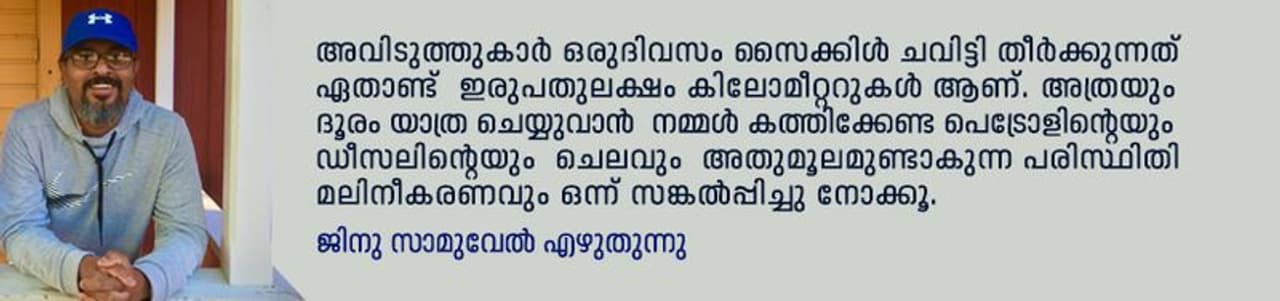 എല്ലാം വിളിപ്പുറത്തെത്തുന്ന കാലമാണിത്. ടാക്സിയും ഭക്ഷണവും എല്ലാം. എങ്കിലും സൈക്കിൾ ചവിട്ടുന്നത് കൊണ്ട് ഒരുപാട് മെച്ചമുണ്ട്. സൈക്കിളിൽ പോകാനുള്ള ദൂരമാണെങ്കിൽ സൈക്കിളിലിൽ പോകാം. വ്യായാമമാകും, ഇന്ധനം നൽകി കാശ് കളയേണ്ട, പരിസ്ഥിതിസൗഹാർദ്ദപരവുമാണ്. പക്ഷേ, അതിനുള്ള സൗകര്യം കൂടിയുണ്ടാകണം.