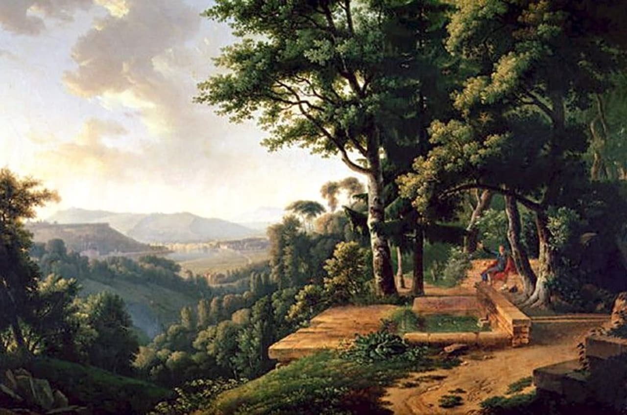 Jean Jacques Rousseau meditating in the park at La Rochecordon, 1770.oil painting by Alexandre-Hyacinthe Dunouy (1757-1841)