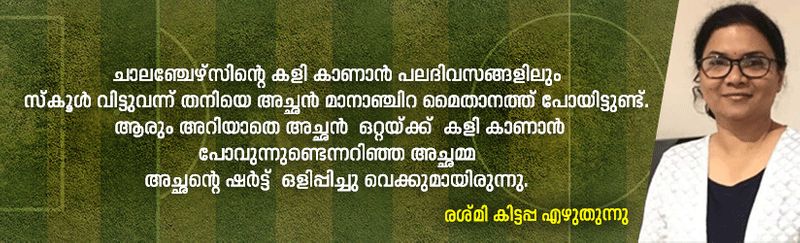 1940-കളുടെ തുടക്കത്തില് കോഴിക്കോട് നാലാം ഗേറ്റിനു സമീപം അമലാപുരി പള്ളി നില്ക്കുന്ന സ്ഥലം വലിയൊരു പറമ്പായിരുന്നു. അവിടെ വാടകയ്ക്കായി കൊടുത്ത ആറുവീടുകളില് ഒരു വീട്ടിലായിരുന്നു എന്റെ അച്ഛന്റെ കുട്ടിക്കാലം. ആ പറമ്പിലെ താമസക്കാരായ കുട്ടികളോടൊത്തായിരുന്നു കളി. അച്ഛന് നാലാം ക്ലാസ്സില് പഠിക്കുന്ന കാലം. മുത്തച്ഛന്റെ കൂടെ ശനി-ഞായര് ദിവസങ്ങളില് മാനാഞ്ചിറ മൈതാനത്തെ ഫുട്ബോള് കളി കാണാന് പോവുക പതിവായിരുന്നു. വെള്ളക്കാരും ചാലഞ്ചേഴ്സിലെ കളിക്കാരും തമ്മിലായിരിക്കും മിക്കപ്പോഴും കളിയുണ്ടാവുക. അതില് ജയിക്കുന്നത് ചാലഞ്ചേഴ്സും. സ്കൂള് വിട്ടുവന്നാല് ഷര്ട്ടഴിച്ചിടണം. ഷര്ട്ടിടാതെയാണ് കുട്ടികളുടെ കൂടെ കളിക്കുന്നത്. ചാലഞ്ചേഴ്സിന്റെ കളി കാണാന് പലദിവസങ്ങളിലും സ്കൂള് വിട്ടുവന്ന് തനിയെ അച്ഛന് മാനാഞ്ചിറ മൈതാനത്ത് പോയിട്ടുണ്ട്. ആരും അറിയാതെ അച്ഛന് ഒറ്റയ്ക്ക് കളി കാണാന് പോവുന്നുണ്ടെന്നറിഞ്ഞ അച്ഛമ്മ അച്ഛന്റെ ഷര്ട്ട് ഒളിപ്പിച്ചു വെക്കുമായിരുന്നു. ഷര്ട്ടിടാതെ വെറും ട്രൗസര് മാത്രം ധരിച്ചുകൊണ്ട് അച്ഛന് എത്രയോ കുറി മാനാഞ്ചിറ മൈതാനത്തിന്റെ അരമതിലില് സ്ഥാനം പിടിച്ചിട്ടുണ്ട്.