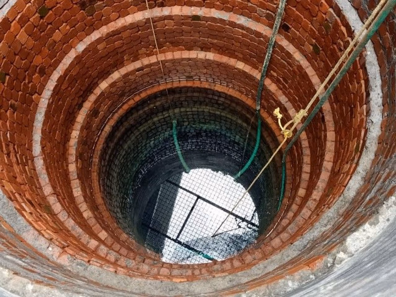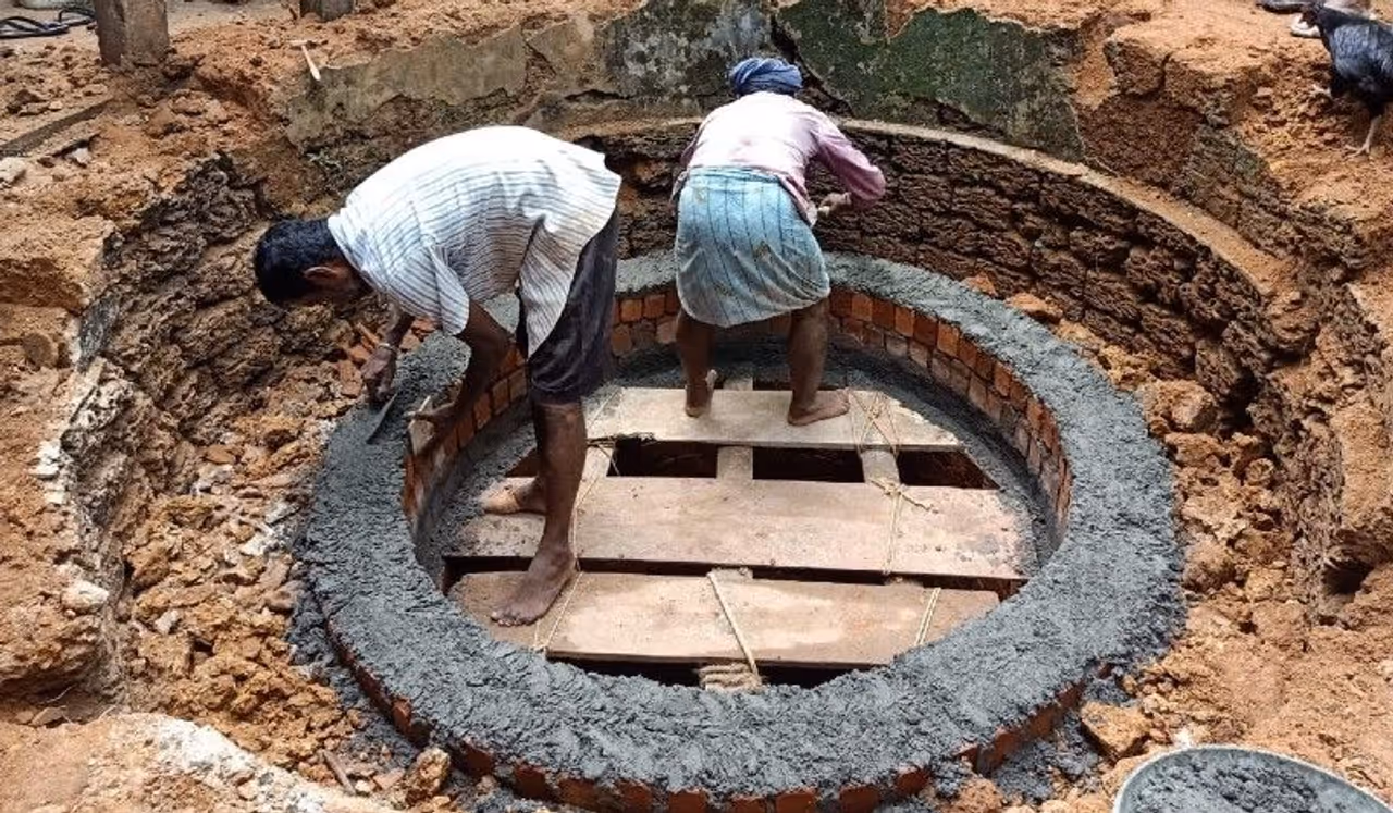 കിണറ്റില് സ്ഥാപിച്ച നെല്ലിപ്പടി ഇഷ്ടിക കൊണ്ട് കെട്ടുന്നു