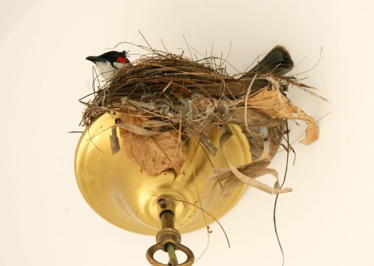 കുഞ്ഞിക്കൊക്കുകളില് നാരും പടര്പ്പുമൊക്കെ കണ്ടപ്പോള് മനസ്സിലായി, കൂടൊരുക്കാനുള്ളപുറപ്പാടാണ്. അവരതിന് ഇടം കണ്ടെത്തിയതാകട്ടെ ഉമ്മറത്തെ സീലിങ്ങില് മനോഹരമായി തൂക്കിയിട്ട അലങ്കാര വിളക്കിലും.
