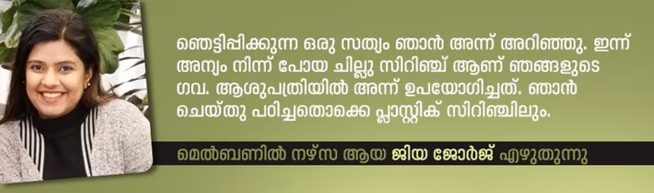 മെല്ബണില് നഴ്സ ആയ ജിയ ജോര്ജ് എഴുതുന്നു: പേടിച്ചരണ്ട മാന് പേടയെ പോലെ ഞാന് മരുന്ന് വലിച്ചു. ചെറുവിരല് പിസ്റ്റണില്, ചൂണ്ടു വിരലും തള്ള വിരലും കൊണ്ട് സിറിഞ്ചില്. സൂക്ഷിച്ചു നോക്കിയാല് ഭരതനാട്യം പോലെ തന്നെ. എന്റെ കാട്ടായം കണ്ടു മാഡം പറഞ്ഞു. 'വെയിറ്റ് മാ, വി ക്യാന് ഗിവ് ഇന് ഡിസ്പോസബിള് സിറിഞ്ച്. '