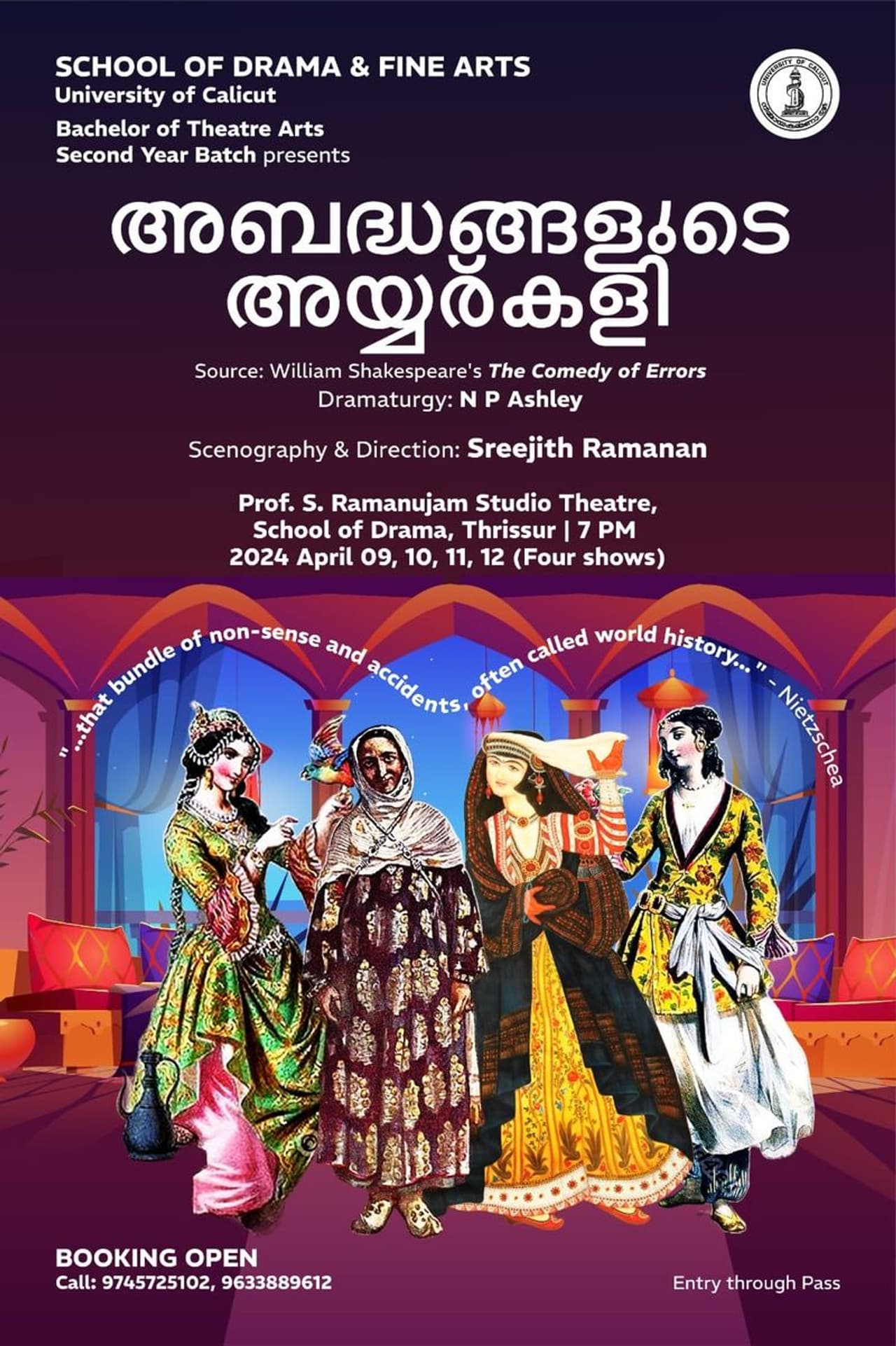 തൃശൂര്: വില്യം ഷേക്സ്പിയറുടെ തട്ടുപൊളിപ്പന് തമാശനാടകം. പത്താം നൂറ്റാണ്ടിലെ അറബ്- പേര്ഷ്യന് പശളചാത്തലത്തിലേക്കുള്ള പറിച്ചുനടല്. പൗരത്വം, ദേശീയ സ്വത്വം, വിഭജനം, അഭയാര്ത്ഥികള് തുടങ്ങിയ സമകാലിക ഇന്ത്യനവസ്ഥകളിലൂടെ കടന്നുപോവുന്ന രംഗഭാഷ്യം. തൃശൂര് സ്കൂള് ഓഫ് ഡ്രാമയില് ഏപ്രില് 9 മുതല് 12 വരെ നടക്കുന്ന 'അബദ്ധങ്ങളുടെ അയ്യരുകളി' എന്ന നാടകത്തിന് പറയാന് സവിശേഷതകളേറെ.
