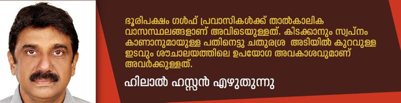 ഭൂരിപക്ഷം ഗള്ഫ് പ്രവാസികള്ക്ക് താല്കാലിക വാസസ്ഥലങ്ങളാണ് അവിടെയുള്ളത്. കിടക്കാനും സ്വപ്നം കാണാനുമായുള്ള പതിനെട്ടു ചതുരശ്ര അടിയില് കുറവുള്ള ഇടവും ശൗചായത്തിലെ ഉപയോഗ അവകാശവുമാണ് അവര്ക്കുള്ളത്. കുബ്ബൂസും തൈരും ചോറും പരിപ്പു കറിയും എന്ന നിലയില് ഏറ്റവും പരിമിതമായ ഭക്ഷണമാണ് പലര്ക്കുമുള്ളത്. വാരാന്ത്യങ്ങളില് സുഹൃത്തുക്കളുമായി ചേര്ന്ന് അവരവരുടേതായ പ്രാദേശിക രുചികളിലുള്ള വിഭവങ്ങളുണ്ടാക്കി കഴിക്കുകയും കുറച്ചു പാട്ടും കളിയുമായി കഴിയുക മാത്രമാണ് ആര്ഭാടം . ചിലരെങ്കിലും നിര്ഭാഗ്യവശാല് ദുശ്ലീലങ്ങളില് അകപ്പെട്ടു പോവുകയും ദുരിതാവസ്ഥയില് ചെന്നെത്താറുമുണ്ട് .