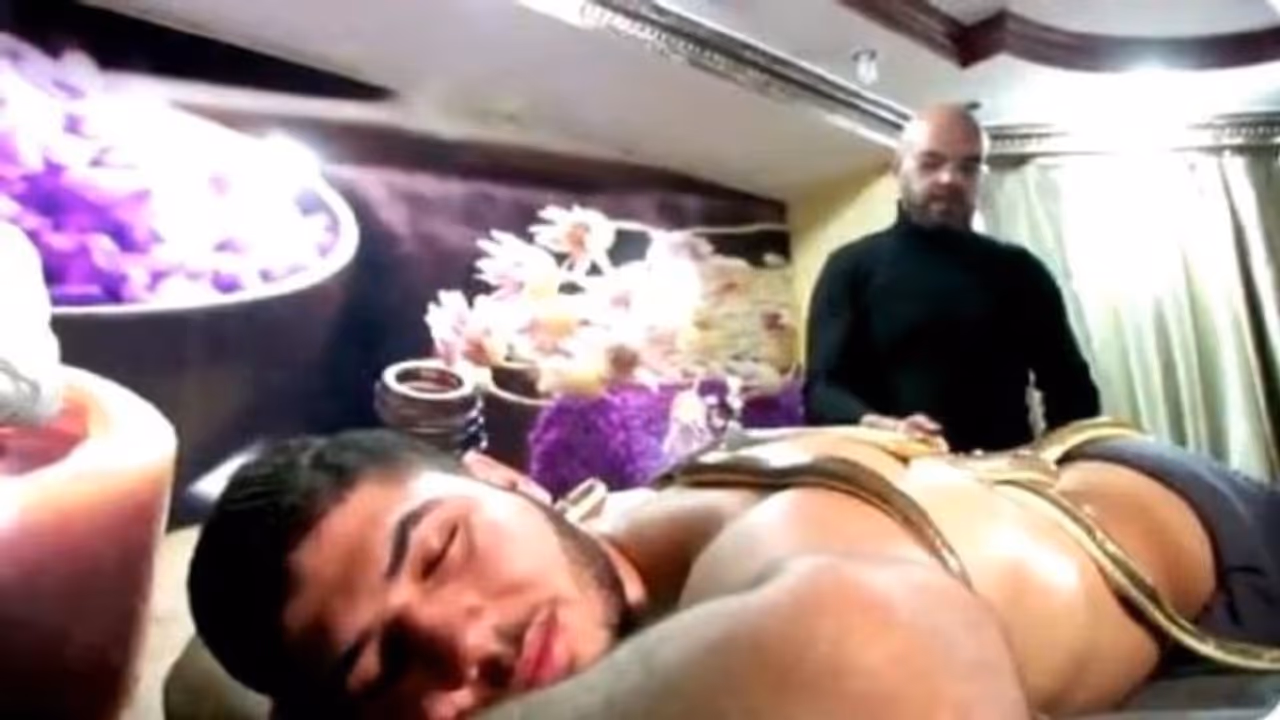 ദേഹത്ത് മുഖത്തും പുറത്തും കഴുത്തിലും കൈകളിലും കാലുകളിലുമെല്ലാം പാമ്പുകള് ഇഴയുന്നു. പാമ്പുകളെ വച്ച് തന്നെ ദേഹം മസാജ് ചെയ്യുന്നു.