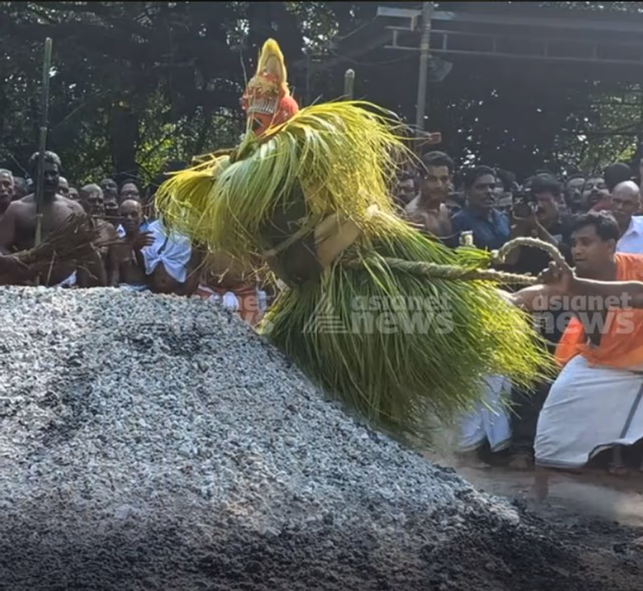 കോമരങ്ങളെ തള്ളിമാറ്റി നാലുറഞ്ഞു തീത്തുള്ളിയ തീച്ചാമുണ്ഡിയെ കണ്ടപ്പോഴാണ് ആരെയാണ് തങ്ങള് പരീക്ഷിക്കുന്നതെന്ന ബോധം നാട്ടരചന്മാരുടെ തലയില് ഉദിക്കുന്നത്. കുതിച്ചോടി കനല്ക്കുന്നത്തുറഞ്ഞലറുകയാണ് ചാമുണ്ഡി. കനലില് മലര്ന്നും കമിഴ്ന്നുമൊക്കെ ഉരുളുകയാണ് തീച്ചാമുണ്ഡി. ഒപ്പമുള്ള കനലാടിമാര് വലിച്ചെടുത്തുനോക്കി. പിടിച്ചെടുക്കാൻ നോക്കി. പക്ഷേ ഓരോ തവണയും മാറ്റിയിട്ടും കുതറിയോടി വീണ്ടുംവീണ്ടും കനല്ക്കൂമ്പാരത്തില് ആറാടി അട്ടഹസിച്ചു ചാമുണ്ഡി. തീക്കണ്ണുകള് ചുകചുകന്നു. ശീതമേറിത്തരിക്കുന്നെന്ന് പതം പറഞ്ഞ് പരിഹസിച്ചു ചിരിച്ചു. പിന്നെ വലതുറഞ്ഞു. വലതുകത്തിക്കേറിയപ്പോള് ഇടതുറഞ്ഞു. കുരുന്നോലക്കൊടി കരിഞ്ഞു. അപ്പോഴും തീയില് മലര്ന്നുകിടന്ന് അമറി തീച്ചാമുണ്ഡി.