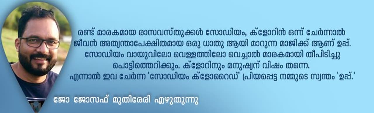 രണ്ട് മാരകമായ രാസവസ്തുക്കള്-സോഡിയം, ക്ളോറിന്- ഒന്നിച്ചുചേര്ന്നാല് ജീവന് അത്യന്താപേക്ഷിതമായ ഒരു ധാതു ആയി മാറുന്ന മാജിക്ക് ആണ് ഉപ്പ്. സോഡിയം വായുവിലോ വെള്ളത്തിലോ വെച്ചാല് മാരകമായി തീപിടിച്ചു പൊട്ടിത്തെറിക്കും. ക്ളോറിനും മനുഷ്യന് വിഷം തന്നെ. എന്നാല് ഇവ ചേര്ന്ന 'സോഡിയം ക്ളോറൈഡ്' പ്രിയപ്പെട്ട നമ്മുടെ സ്വന്തം 'ഉപ്പ്.'