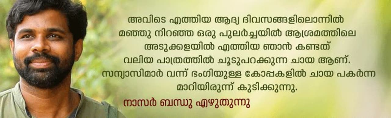 അവിടെ എത്തിയ ആദ്യ ദിവസങ്ങളിലൊന്നില് മഞ്ഞു നിറഞ്ഞ ഒരു പുലര്ച്ചയില് ആശ്രമത്തിലെ അടുക്കളയില് എത്തിയ ഞാന് കണ്ടത് വലിയ പാത്രത്തില് ചൂടുപറക്കുന്ന ചായ ആണ്. സന്യാസിമാര് വന്ന് ഭംഗിയുള്ള കോപ്പകളില് ചായ പകര്ന്ന് മാറിയിരുന്ന് കുടിക്കുന്നു. എനിക്ക് സന്തോഷമായി. ഞാന് ചെന്ന് ചിത്രപ്പണികളുളള ഒരു കോപ്പയെടുത്ത് വലിയ പാത്രത്തില് നിന്ന് ചായ പകര്ന്നെടുത്തു.
