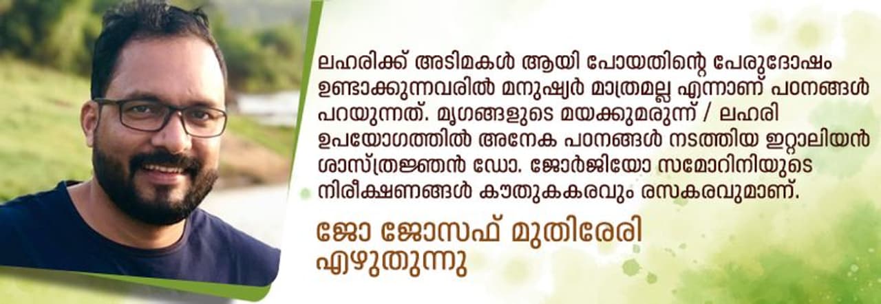 മനുഷ്യര് മാത്രമല്ല ലഹരിക്ക് അടിമകള്. മൃഗലോകത്തിലും മഹാകുടിയന്മാരും മയക്കുമരുന്നിന് അടിമകള് ആയി 'കുടുംബ ജീവിതം' വരെ താറുമാറായി പോയവരും ഉണ്ട്. ജോ ജോസഫ് മുതിരേരി എഴുതുന്നു