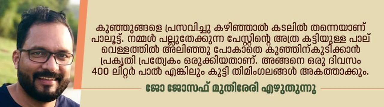 ജോ ജോസഫ് മുതിരേരി എഴുതുന്നു: കുഞ്ഞുങ്ങളെ പ്രസവിച്ചു കഴിഞ്ഞാല് കടലില് തന്നെയാണ് പാലൂട്ട്. നമ്മള് പല്ലുതേക്കുന്ന പേസ്റ്റിന്റെ അത്ര കട്ടിയുള്ള പാല് വെള്ളത്തില് അലിഞ്ഞു പോകാതെ കുഞ്ഞിന്കുടിക്കാന് പ്രകൃതി പ്രത്യേകം ഒരുക്കിയതാണ്. അങ്ങനെ ഒരു ദിവസം 400 ലിറ്റര് പാല് എങ്കിലും കുട്ടി തിമിംഗലങ്ങള് അകത്താക്കും