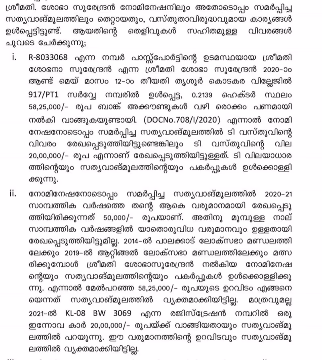 20 ലക്ഷത്തോളം വിലവരുന്ന ഇന്നോവ കാറ് വാങ്ങിയെന്ന് സത്യവാങ്മൂലത്തിൽ പറയുന്ന ശോഭ ഇതിന്റെ വരുമാന ഉറവിടം വ്യക്തമാക്കിയിട്ടില്ലെന്നും പരാതിയിൽ ചൂണ്ടികാണിച്ചിട്ടുണ്ട്