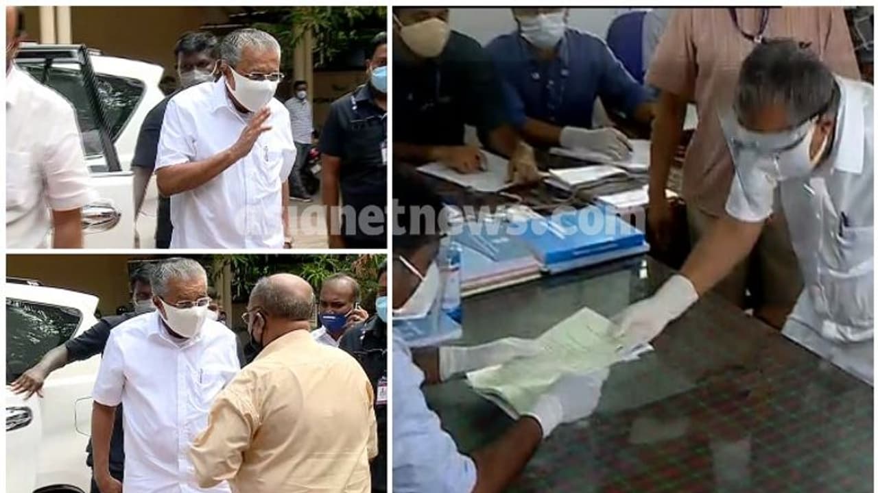 കണ്ണൂർ: ധർമ്മടത്ത് മുഖ്യമന്ത്രി പിണറായി വിജയനെതിരെ ആര് മത്സരിക്കണമെന്ന അനിശ്ചിതത്വത്തിൽ യുഡിഎഫ് കുഴങ്ങുമ്പോൾ, പിണറായി പത്രിക സമർപ്പിച്ചു. വരണാധികാരിയായ അസിസ്റ്റന്റ് ഡെവലെപ്മെന്റ് ഓഫീസർ ബെവിൻ ജോൺ വർഗീസിന് മുന്നിലാണ് പത്രിക നൽകിയത്. മൂന്ന് സെറ്റ് പത്രികകളാണ് സമർപ്പിച്ചത്. മുഖ്യമന്ത്രിയുടെ മണ്ഡലം പ്രതിനിധി പി ബാലൻ, സിപിഎം കണ്ണൂർ ജില്ലാ സെക്രട്ടറി എം വി ജയരാജൻ, സിപിഐ ദേശീയകൗൺസിലംഗം സി എൻ ചന്ദ്രൻ എന്നിവരും മുഖ്യമന്ത്രിക്കൊപ്പമുണ്ടായിരുന്നു.