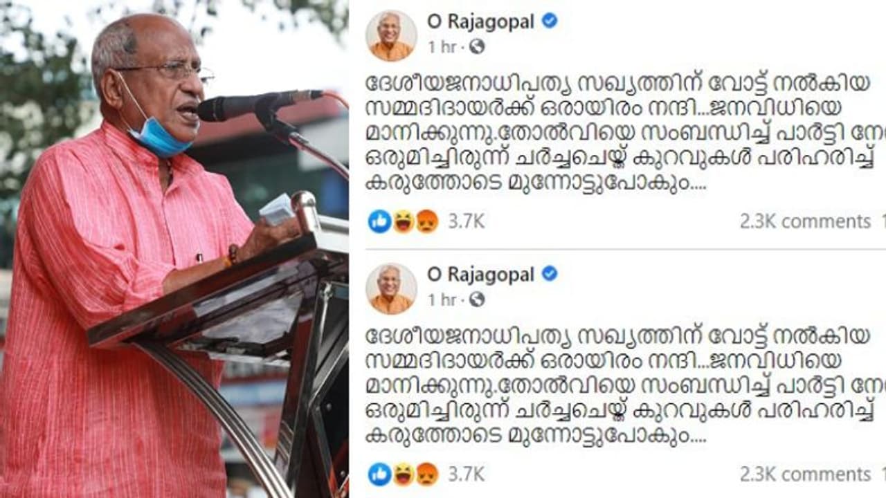 ദേശീയജനാധിപത്യ സഖ്യത്തിന് വോട്ട് നൽകിയ സമ്മദിദായർക്ക് ഒരായിരം നന്ദി...ജനവിധിയെ മാനിക്കുന്നു.തോൽവിയെ സംബന്ധിച്ച് പാർട്ടി നേതൃത്വം ഒരുമിച്ചിരുന്ന് ചർച്ചചെയ്ത് കുറവുകൾ പരിഹരിച്ച് കരുത്തോടെ മുന്നോട്ടുപോകും. എന്നായിരുന്നു ഒ രാജഗോപാലിന്റെ ഫേസ്ബുക്ക് കുറിപ്പ്