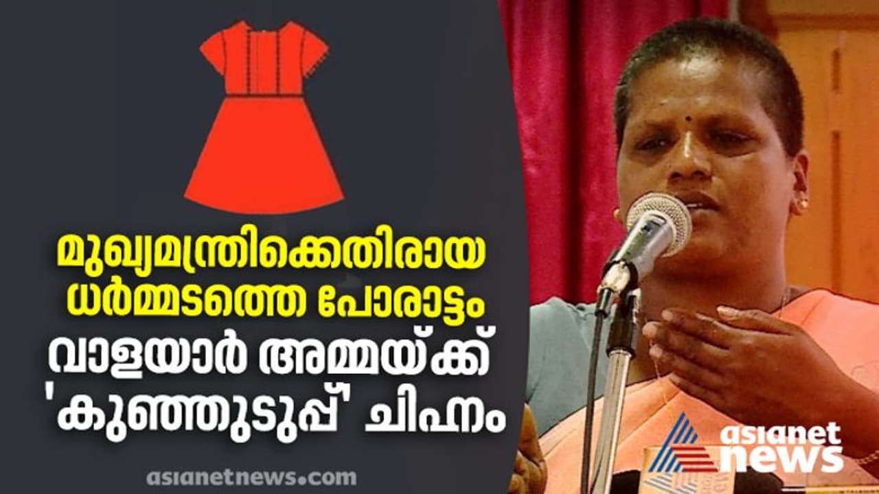 തിരുവനന്തപുരം: മക്കളുടെ മരണത്തിൽ നീതി ലഭിക്കാത്തതിൽ പ്രതിഷേധിച്ച് ധർമ്മടം മണ്ഡലത്തിൽ മുഖ്യമന്ത്രി പിണറായി വിജയനെതിരെ സ്വതന്ത്രയായി മത്സരിക്കുന്ന വാളയാർ പെൺകുട്ടികളുടെ അമ്മ ഭാഗ്യവതിക്ക് 'കുഞ്ഞുടുപ്പ്' തെരഞ്ഞെടുപ്പ് ചിഹ്നം. 'ഫ്രോക്ക്’ ചിഹ്നമാണ് തെരഞ്ഞെടുപ്പ് കമ്മീഷൻ അമ്മയ്ക്ക് അനുവദിച്ചതെന്ന് പ്രചാരണത്തിന് നേതൃത്വം നല്കുന്ന വാളയാർ നീതി സമിധി രക്ഷാധികാരി സി.ആര്.നീലകണ്ഠൻ അറിയിച്ചു.