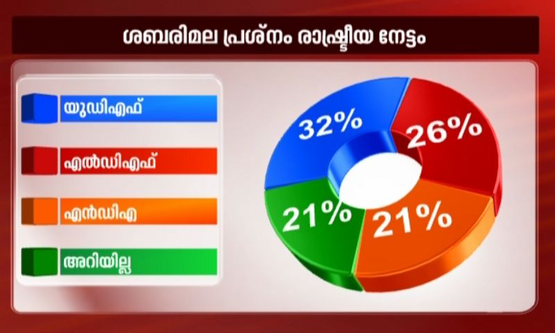 ശബരിമല വിഷയത്തില് രാഷ്ട്രീയ നേട്ടമുണ്ടാക്കിയത് യുഡിഎഫ് എന്ന് സര്വെ. 32 ശതമാനം പേര് രാഷ്ട്രീയ നേട്ടം യുഡിഎഫിന് എന്ന് വിലയിരുത്തി. 26 ശതമാനം എല്ഡിഎഫിനെ പിന്തുണച്ചപ്പോള് എന്ഡിഎയെ തുണച്ചത് 21 ശതമാനം മാത്രം