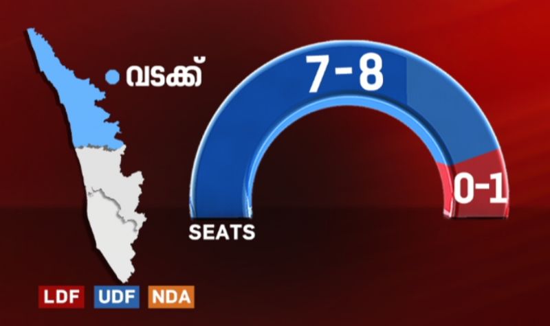 വടക്കന് കേരളത്തില് യുഡിഎഫ് ഏഴ് മുതല് എട്ട് സീറ്റ് വരെ നേടാം. പൂജ്യം മുതല് ഒരു സീറ്റ് വരെ എല്ഡിഎഫിന് ലഭിക്കും. ബിജെപിക്ക് ഒരു സീറ്റ് പോലും ലഭിക്കില്ല. കാസര്കോഡ്, കണ്ണൂര്, വടകര, പാലക്കാട് തുടങ്ങിയ മണ്ഡലങ്ങള് ഉള്പ്പെടുന്നതാണ് വടക്കന് കേരളം.