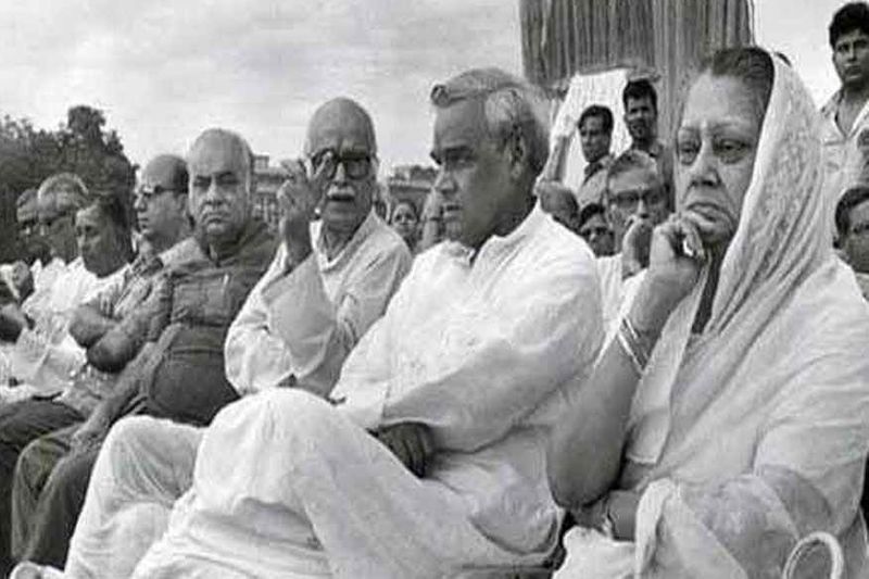 : എ.ബി.വാജ്പേയിയും എൽ.കെ.അദ്വാനിയും രാജമാതാ വിജയരാജെ സിന്ധ്യയോടൊപ്പം