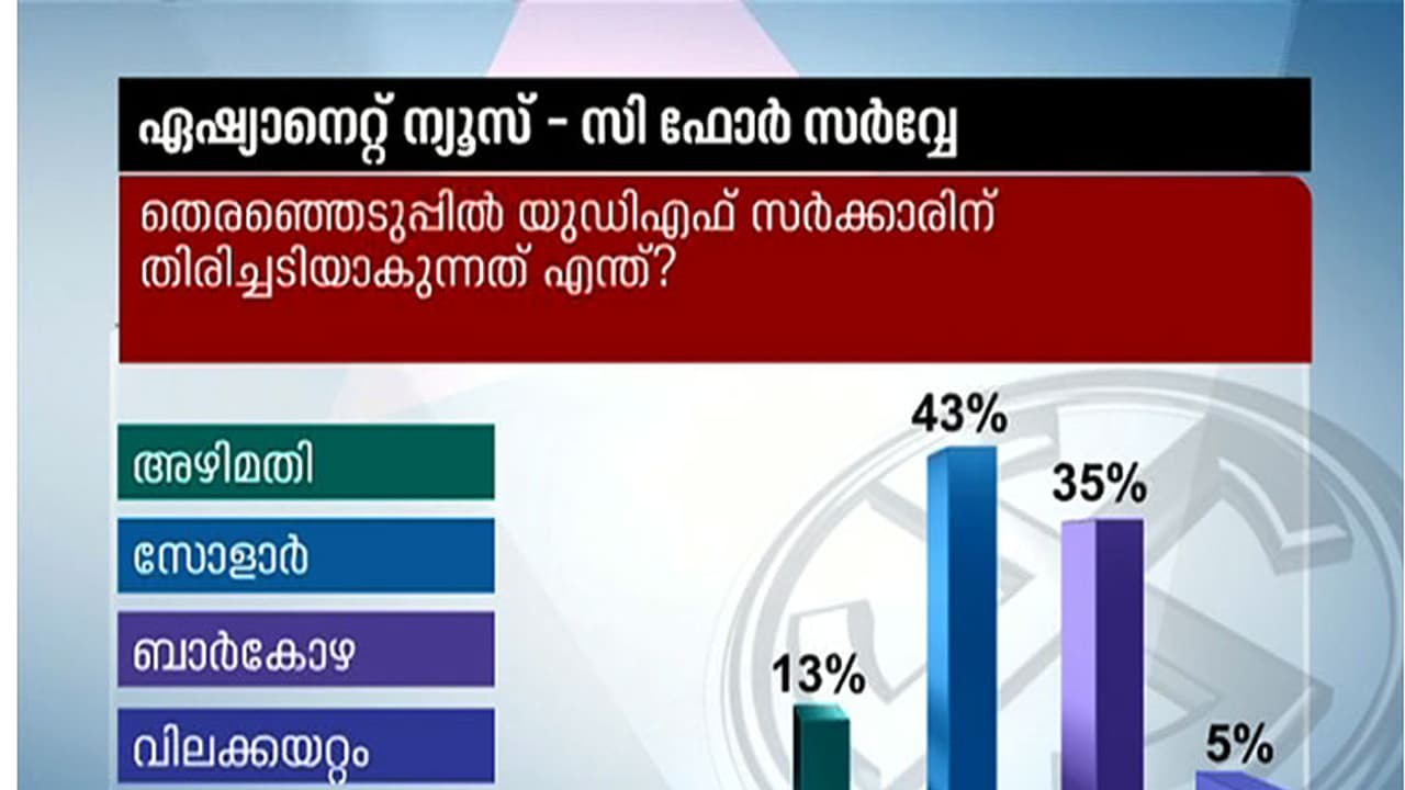 സോളാര് കേസില് സരിതയുടെ വെളിപ്പെടുത്തലിന്റെ പശ്ചാത്തലത്തില് മുഖ്യമന്ത്രി കുറ്റക്കാരനെന്ന് സര്വ്വേയില് പങ്കെടുത്തവരില് 52ശതമാനവും വിശ്വസിക്കുന്നു