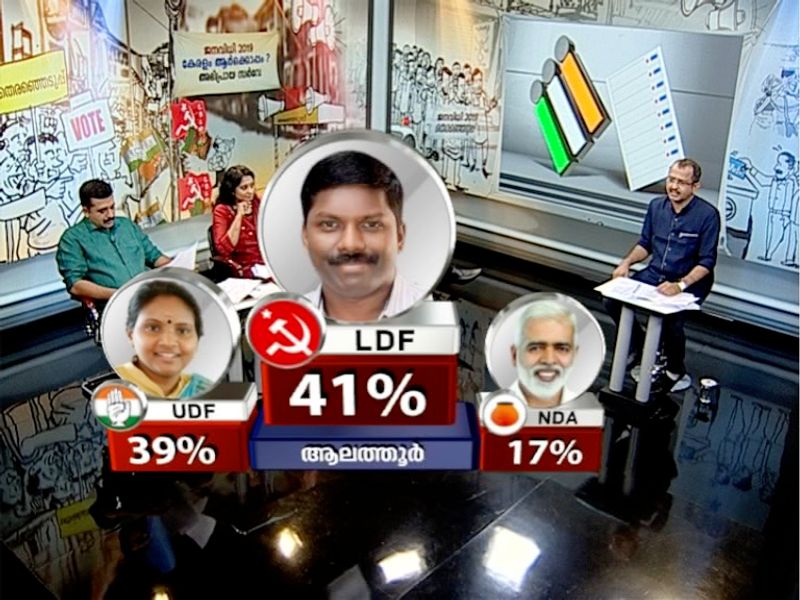 41 ശതമാനം വോട്ട് വിഹിതം നേടി ആലത്തൂരിൽ പി കെ ബിജു പിന്നെയും ചെങ്കൊടി പാറിക്കുമെന്നാണ് സർവേ ഫലം. ശക്തമായ മത്സരം കാഴ്ചവച്ച രമ്യാ ഹരിദാസ് 39 ശതമാനം വോട്ട് വിഹിതം നേടി രണ്ടാമതെത്തും എന്ന് സർവേ ഫലം വ്യക്തമാക്കുന്നു. പതിനേഴ് ശതമാനം വോട്ട് ബിഡിജെഎസിന്റെ ടി വി ബാബു നേടുമെന്നാണ് സർവേ പ്രവചിക്കുന്നത്. ശക്തമായ ഇടതുപക്ഷ അടിത്തറയും കരുത്തുറ്റ സംഘടനാ സംവിധാനവുമായിരിക്കും ഇടതുപക്ഷത്തെ തുണയ്ക്കുക. രണ്ട് തവണ വിജയിച്ച പികെ ബിജുവിനെതിരായ നിഷേധ വോട്ടുകളേയും മറികടന്ന് ഇടതുപക്ഷം വിജയ സാധ്യത കൂട്ടാൻ കാരണം ഇതാകുമെന്നാണ് സർവേ ഫലത്തിൽ നിന്ന് വ്യക്തമാകുന്നത്.