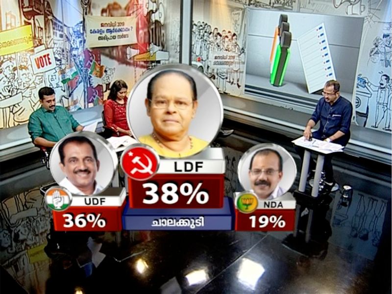 38 ശതമാനം വോട്ട് വിഹിതം നേടി ഇന്നസെന്റ് ജയിച്ചുകയറുമ്പോൾ 36 ശതമാനം വോട്ട് നേടി ബെന്നി ബെഹനാൻ രണ്ടാമതെത്തുമെന്നാണ് പ്രവചനം. കഴിഞ്ഞ നിയമസഭാ തെരഞ്ഞെടുപ്പ് ഫലം കണക്കിലെടുക്കുമ്പോൾ യുഡിഎഫിനാണ് മുൻതൂക്കമെങ്കിലും ശക്തമായ മത്സരത്തിൽ ഇന്നസെന്റ് ഇനിയും ചാലക്കുടിയെ ചുവപ്പിക്കുമെന്നാണ് സർവേ ഫലം.