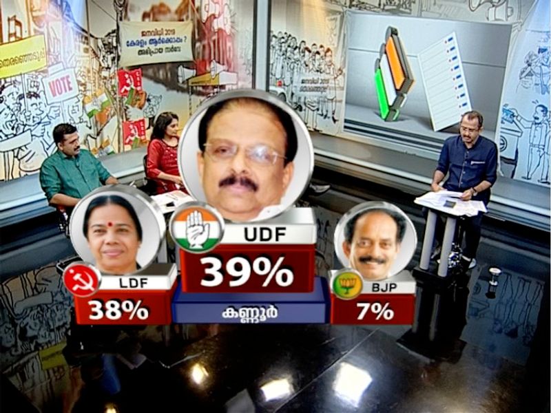 ഒരു ശതമാനം വോട്ടിന്റെ വ്യത്യാസത്തിൽ സിറ്റിംഗ് എംപി പി കെ ശ്രീമതിയെ കെ സുധാകരൻ തോൽപ്പിക്കുമെന്ന് സർവേ ഫലം വ്യക്തമാക്കുന്നു. എൽഡിഎഫ് 38 ശതമാനം വോട്ടും യുഡിഎഫ് 39 ശതമാനം വോട്ട് വിഹിതം നേടുമെന്നാണ് സർവേ ഫലം വ്യക്തമാക്കുന്നത്. ബിജെപിക്കുവേണ്ടി സികെ പത്മനാഭൻ വെറും ഏഴ് ശതമാനം വോട്ട് മാത്രമേ നേടൂ എന്നും സർവേ പ്രവചിക്കുന്നു. കേരളത്തിൽ എൻഡിഎ ഏറ്റവും കുറവ് നോട്ട് നേടുന്ന മണ്ഡലവും കണ്ണൂരാകുമെന്നും സർവേ ഫലം വ്യക്തമാക്കുന്നു.