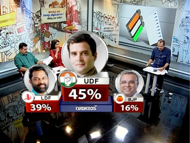 ദേശീയ മാധ്യമങ്ങളുടെ ശ്രദ്ധാ കേന്ദ്രമായ വയനാട്ടിൽ രാഹുൽ തരംഗം പ്രതീക്ഷിച്ചത്ര ഇല്ലെന്നാണ് സർവെ സൂചന. കോൺഗ്രസ് അദ്ധ്യക്ഷന്റെ അപ്രതീക്ഷിത സ്ഥാനാർത്ഥിത്വത്തിന്റെ ആനുകൂല്യം കണക്കിൽ പ്രതിഫലിക്കുന്നില്ല. രാഹുൽ ഗാന്ധിയുടെ വരവോടെ വയനാട്ടിലെ മത്സരം രാഷ്ട്രീയ മത്സരമായെന്ന സൂചനയും കണക്കുകളിലുണ്ട്. അതേ സമയം തുഷാര് വെള്ളാപ്പള്ളിയുടെ സ്ഥാനാർത്ഥിത്വത്തോടെ എൻഡിഎ വോട്ട് വിഹിതം ഇരട്ടിയാകുമെന്നാണ് സർവെ പറയുന്നത്.