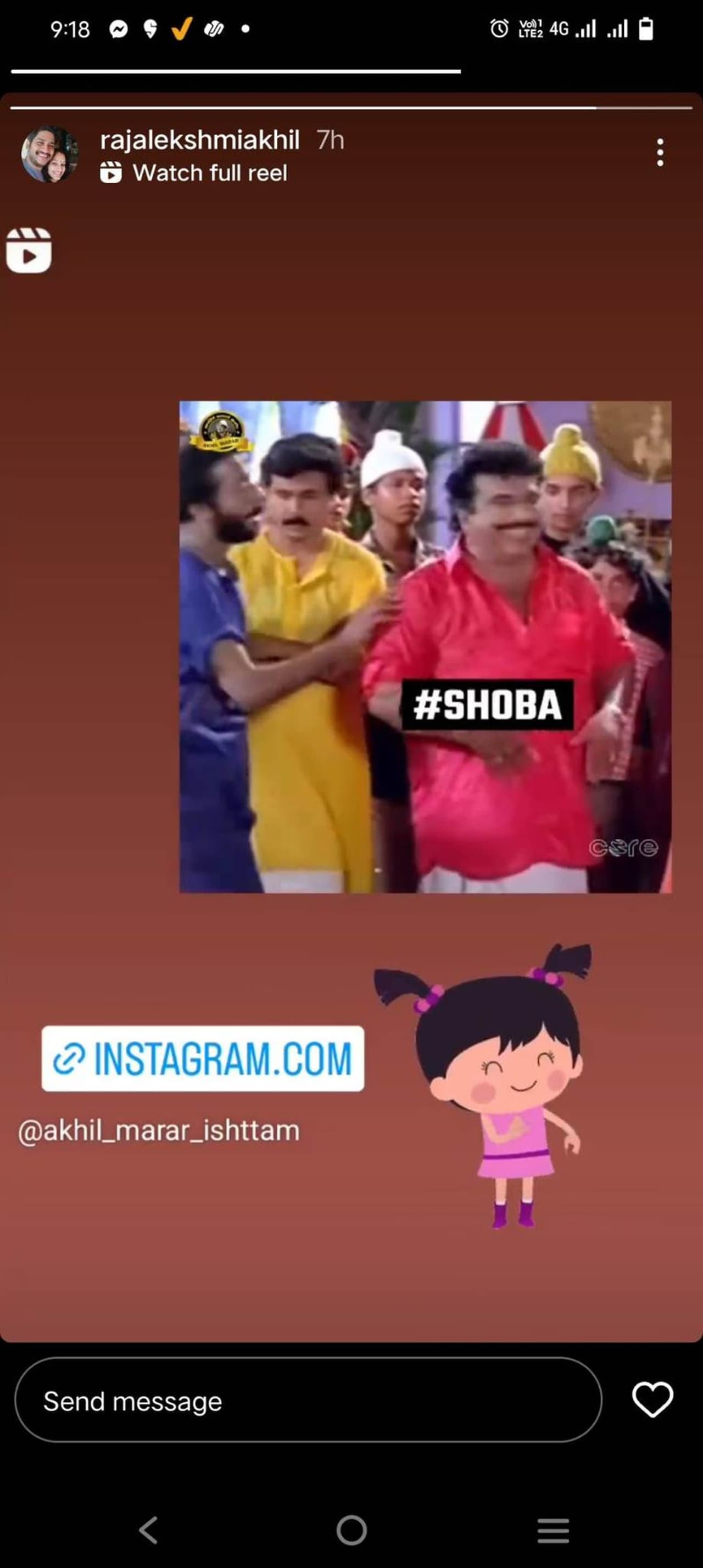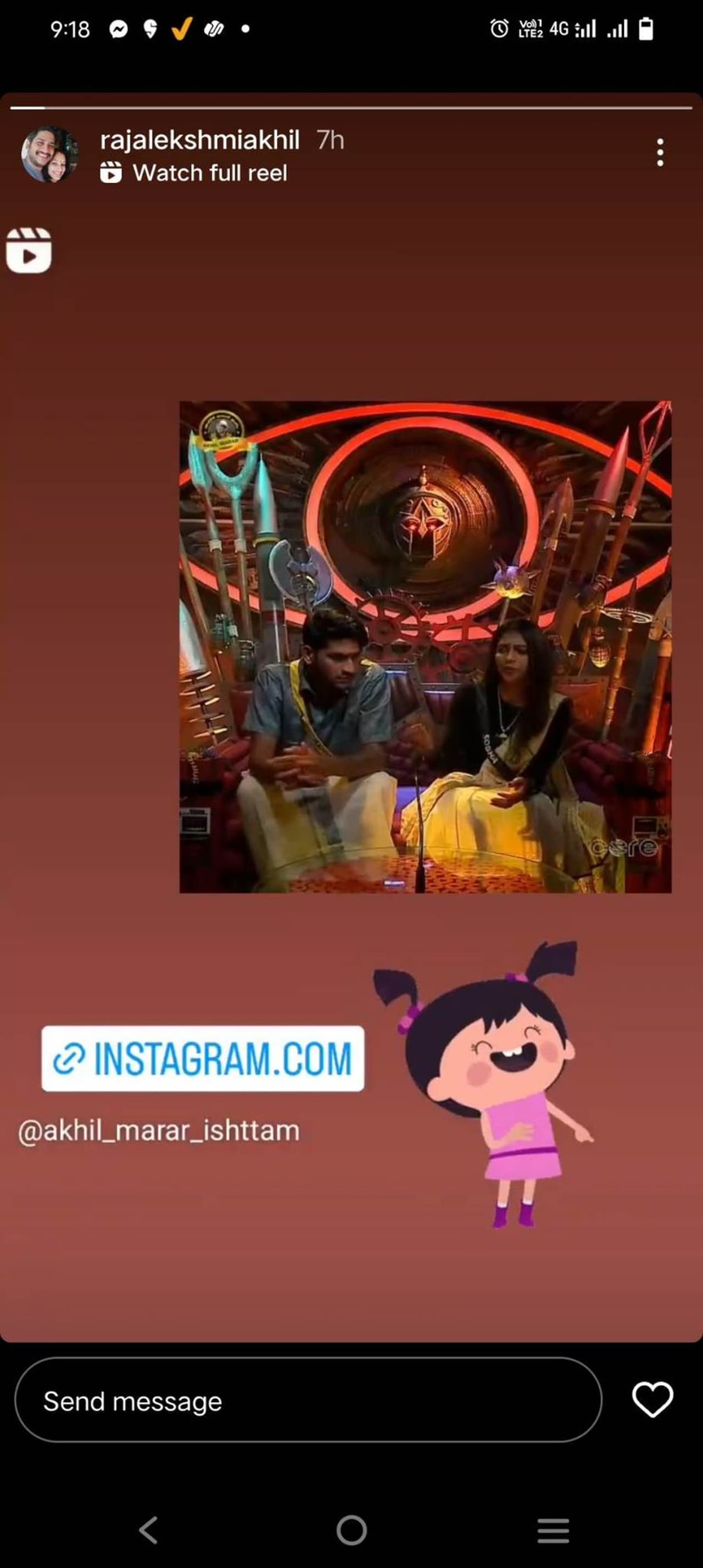 ബിഗ് ബോസ് മലയാളം സീസൺ അഞ്ചിലെ ടോം ആൻഡ് ജെറി കോമ്പോയാണ് അഖിൽ മാരാരുടേതും ശോഭയുടേതും. ഇരുവരും തമ്മിലുള്ള തർക്കങ്ങളും വെല്ലുവിളികളുമെല്ലാം പ്രേക്ഷകർ ഇഷ്ട്ടപെടുന്ന കാര്യമാണ്. അടുത്തിടെ മാരാർ, ശോഭയ്ക്ക് എതിരെ നടത്തിയ സുഖിപ്പിക്കൽ പരാമർശം വലിയ ചർച്ചകൾക്ക് വഴിവച്ചിരുന്നു. റെനീഷയോട് ശോഭ നടത്തിയ ഇതേപരാമർശവും ശ്രദ്ധനേടി. കഴിഞ്ഞ ദിവസം ഇക്കാര്യത്തിൽ മോഹൻലാൽ തീർപ്പും കൽപ്പിച്ചിരുന്നു. ഈ അവസരത്തിൽ ശോഭയെ ട്രോളിക്കൊണ്ടുള്ള മാരാരുടെ ഭാര്യ രാജലക്ഷ്മിയുടെ ഇൻസ്റ്റാഗ്രാം സ്റ്റോറിയാണ് ശ്രദ്ധനേടുന്നത്.