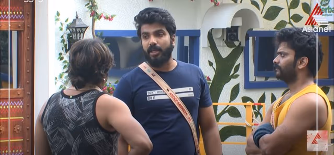 അനൂപും ഫിറോസും മണിക്കുട്ടനും ചേർന്ന് സംസാരക്കുന്നതിനിടയിൽ കൈകാര്യം ചെയ്യാൻ തനിക്കും അറിയാമെന്ന തരത്തിലാണ് ഫിറോസ് സംസാരിക്കുന്നത്. എന്നാൽ ഒരു ഷോയാകുമ്പോൾ അത് പാടില്ലെന്ന് അനൂപ് പറയുന്നു. പുറത്ത് ഇത്തരം വിഷയമുണ്ടായാൽ മാറ്റിനിർത്തി രണ്ടെണ്ണം പൊട്ടിക്കാം, പക്ഷെ ഷോയകുമ്പോൾ അതിന്റെ നിയമങ്ങൾ പാലിക്കണം. ബിഗ് ബോസിനോട് ചോദിക്കാമെന്നും അനൂപ് ഉപദേശികക്കുന്നുണ്ട്.