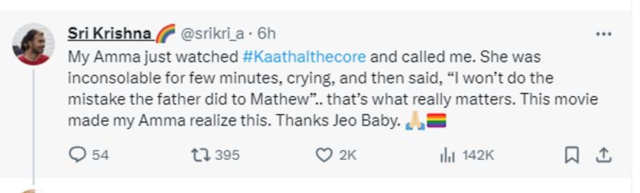 തമിഴ്നാട് സ്വദേശിയായ ശ്രീ കൃഷ്ണയുടേതാണ് പോസ്റ്റ്. "എന്റെ അമ്മ കാതൽ ദ കോർ കണ്ടെന്നെ വിളിച്ചു. ഏതാനും നിമിഷങ്ങൾ ആശ്വസിപ്പിക്കാനാകാത്ത വിധമായിരുന്നു അവർ. ശേഷം പൊട്ടിക്കരഞ്ഞു. എന്നിട്ട് പറഞ്ഞു "അച്ഛൻ മാത്യുവിനോട് ചെയ്ത തെറ്റ് ഞാൻ ചെയ്യില്ല"..അതാണ് ശരിക്കും പ്രധാനം. ഈ സിനിമ എന്റെ അമ്മയ്ക്ക് മനസ്സിലാക്കി കൊടുത്തു. ജിയോ ബേബി ഒരുപാട് നന്ദി", എന്നാണ് ഇയാൾ കുറിച്ചത്. ട്വീറ്റ് പുറത്തുവന്നതിന് പിന്നാലെ നിരവധി പേരാണ് കമന്റുകളും പിന്തുണയുമായും രംഗത്ത് എത്തിയത്. മറ്റൊരു സിനിമ കണ്ടും താന് ഇത്രയധികം കരഞ്ഞിട്ടില്ലെന്നും കൃഷ്ണ കുറിക്കുന്നുണ്ട്.